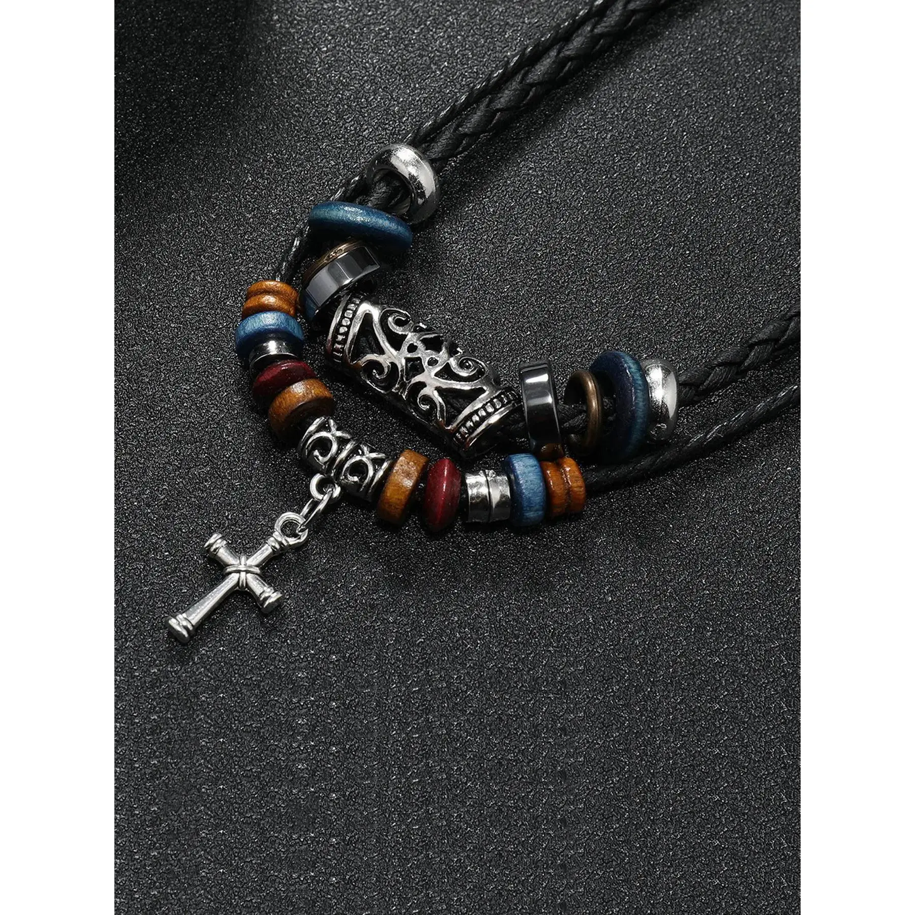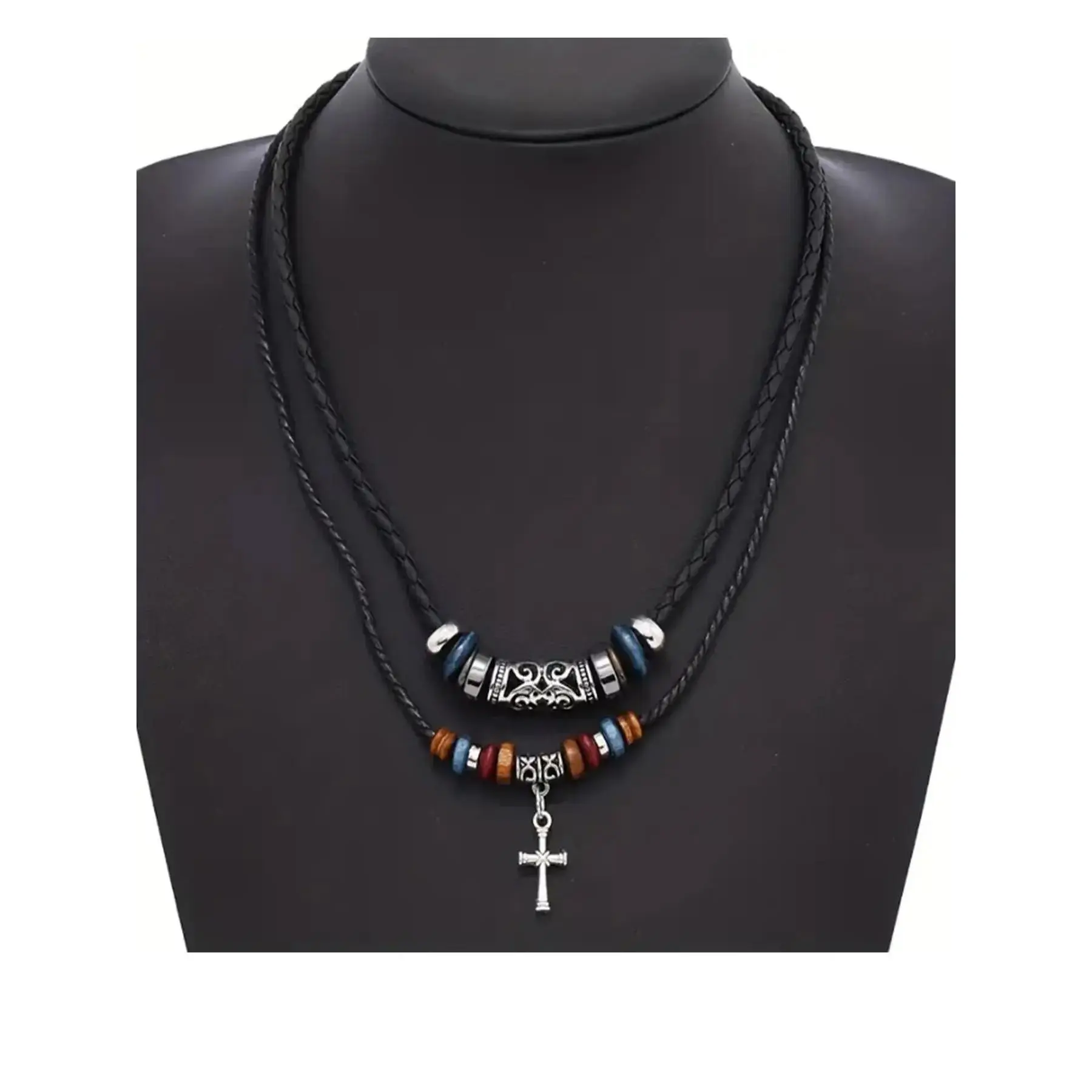 Unisex Boho Style Drawstring Layered Beaded Necklace, Trendy Chic Vintage Retro Necklace, Gorgeous Jewelry As Birthday Gift for Girlfriend & Boyfriend, Cross Charm Necklace