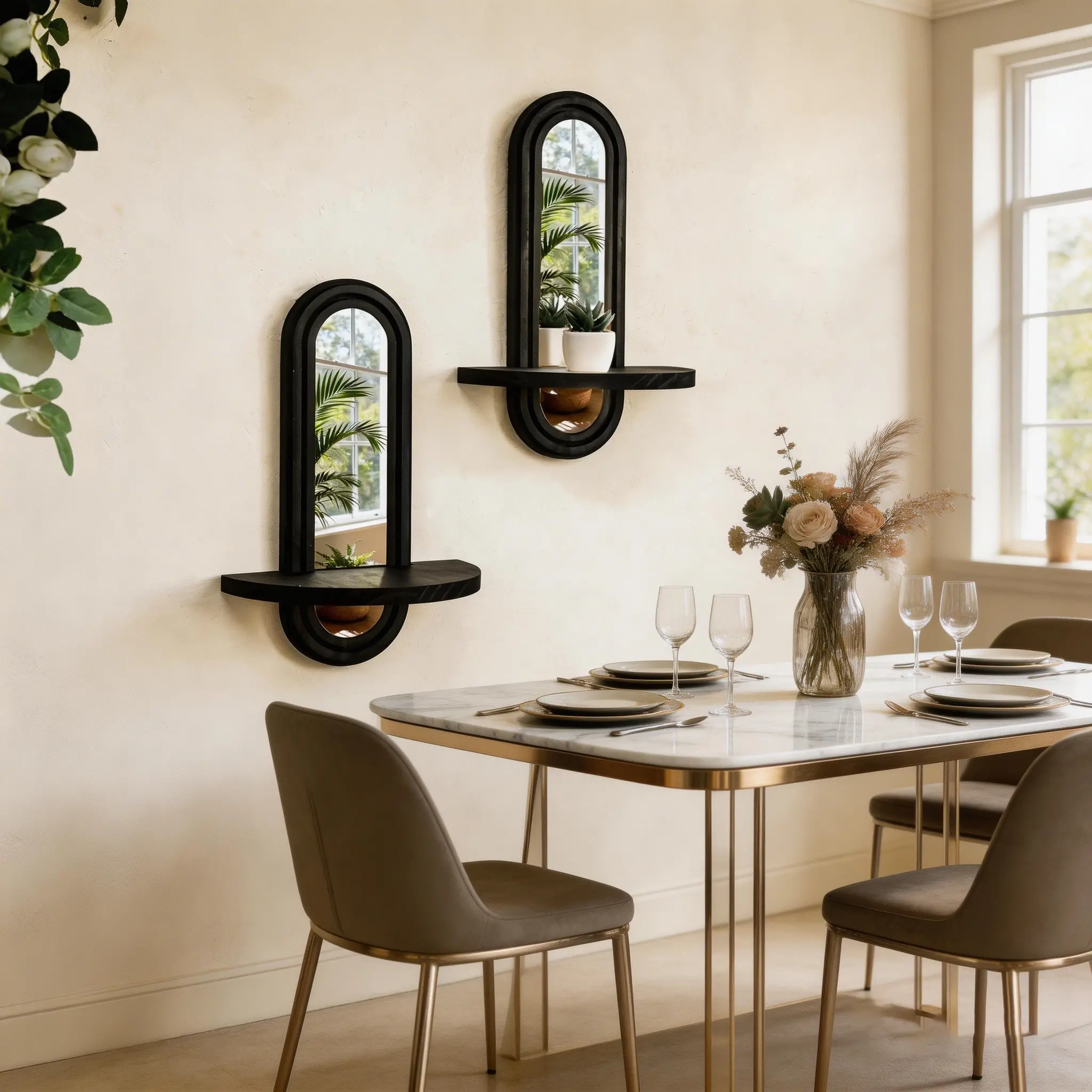 The wall-mounted mirror in the dining room, through the reflection of its lens, makes the dining room appear more spacious and bright. The shelf below can hold small green plants or decorative items, adding vitality and beauty to the dining environment.