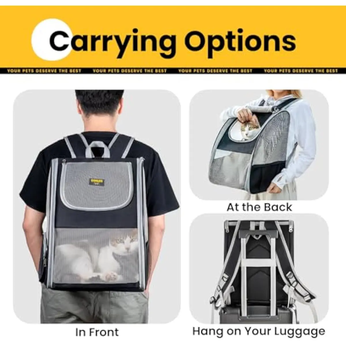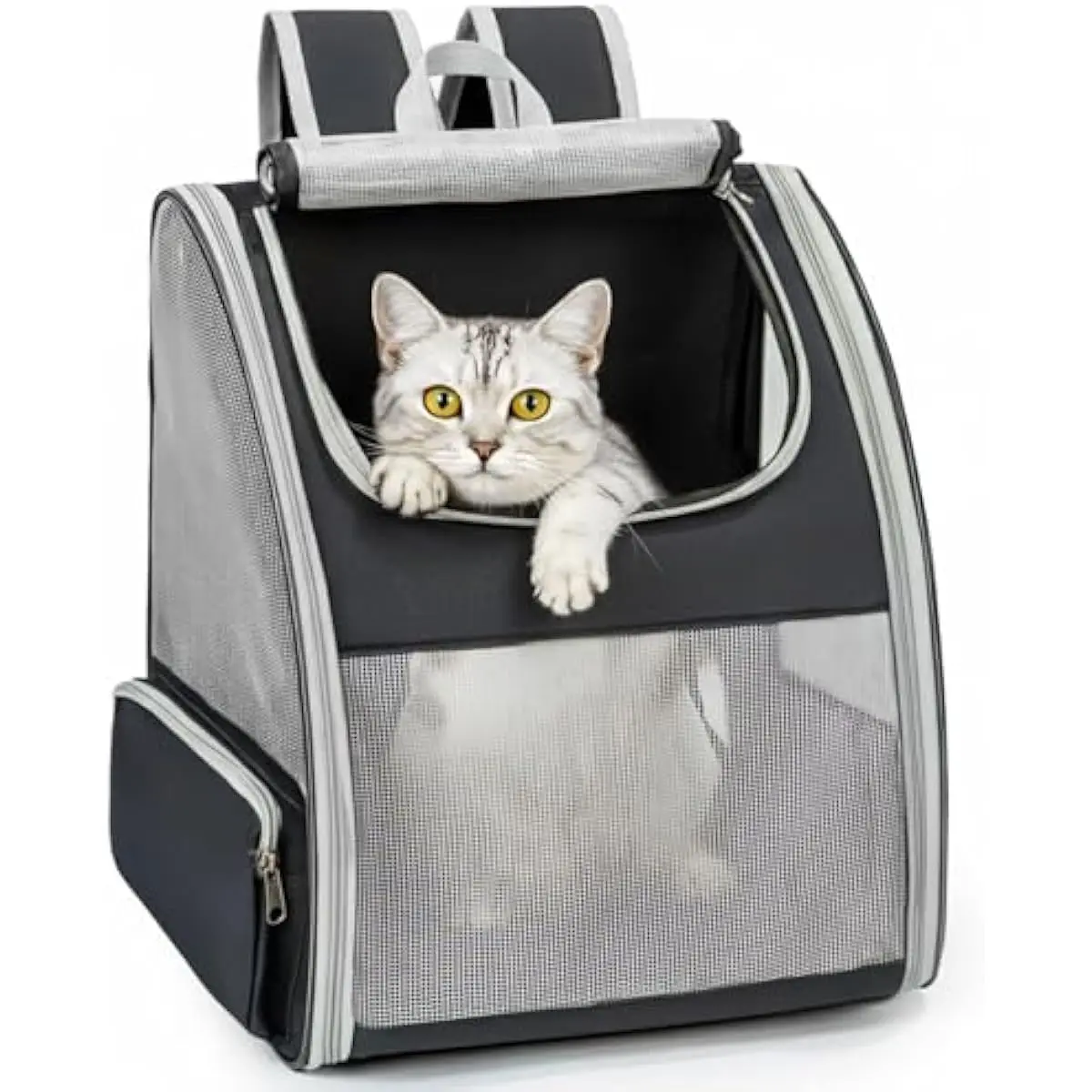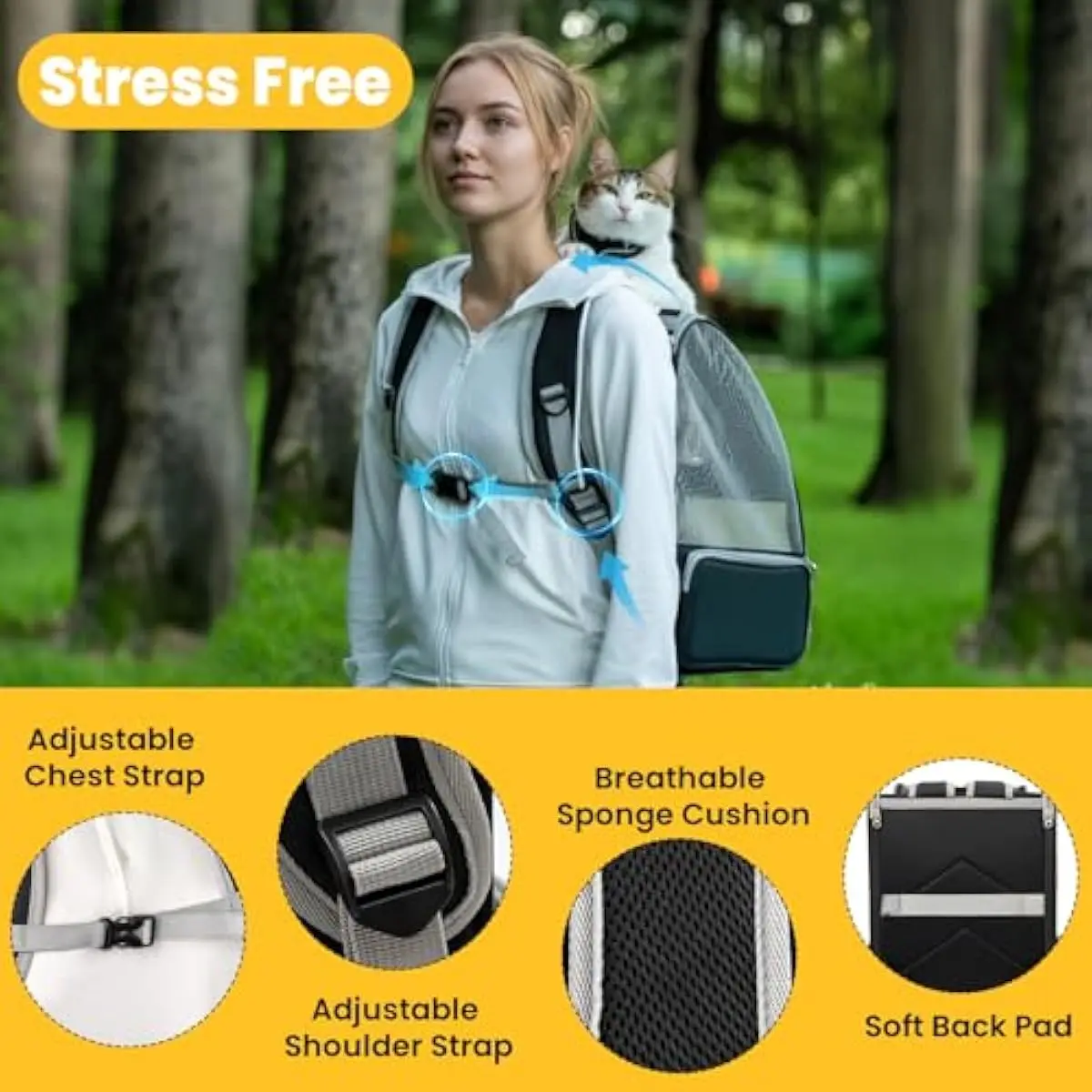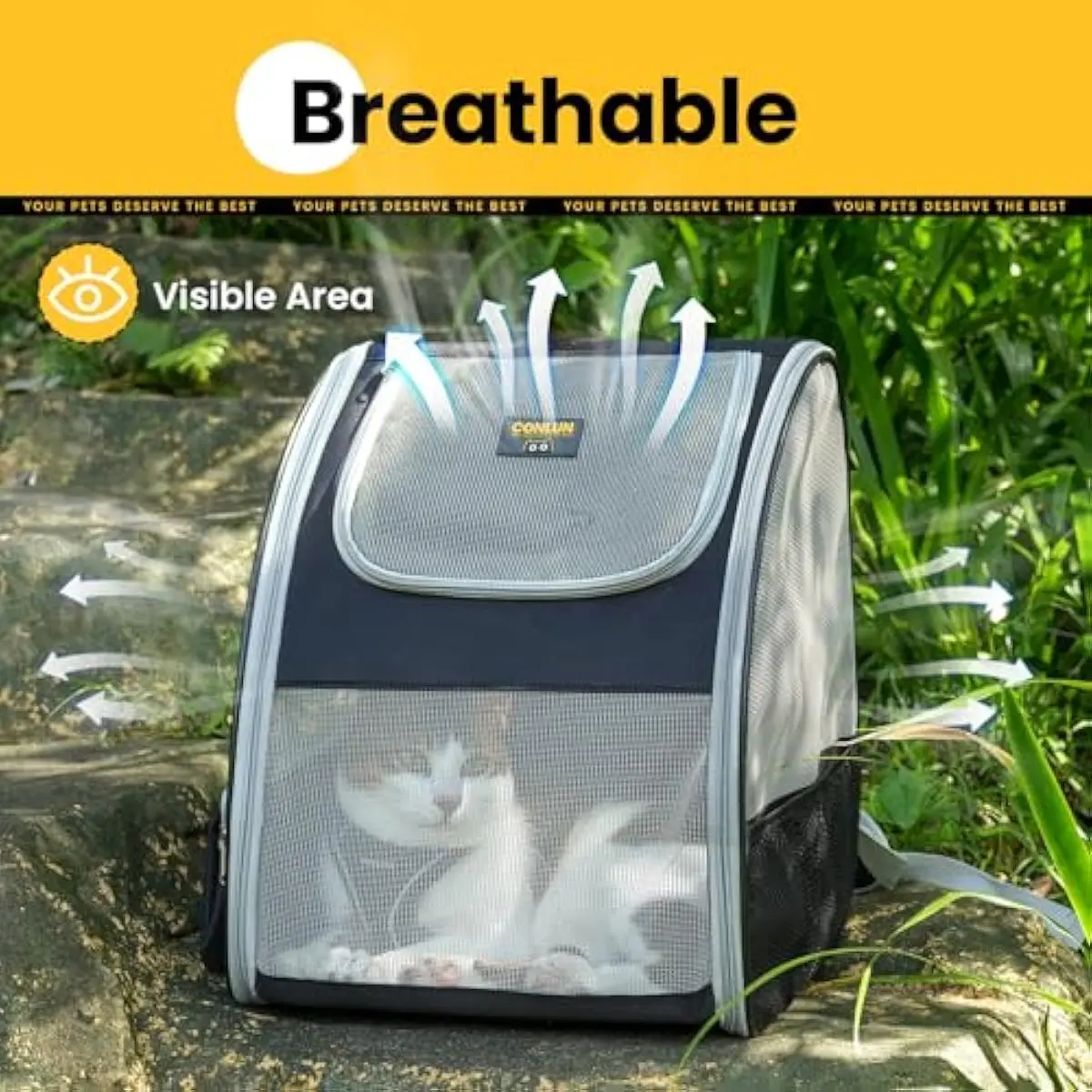 Breathable & Visible:This cat carrier backpack features three high-strength PVC mesh panels, ensuring optimal airflow so your pet can breathe fresh air and observe their surroundings during travel. This effectively reduces anxiety in enclosed spaces. With three access points—top and two side entries—you can easily comfort your pet or let them enter and exit freely.