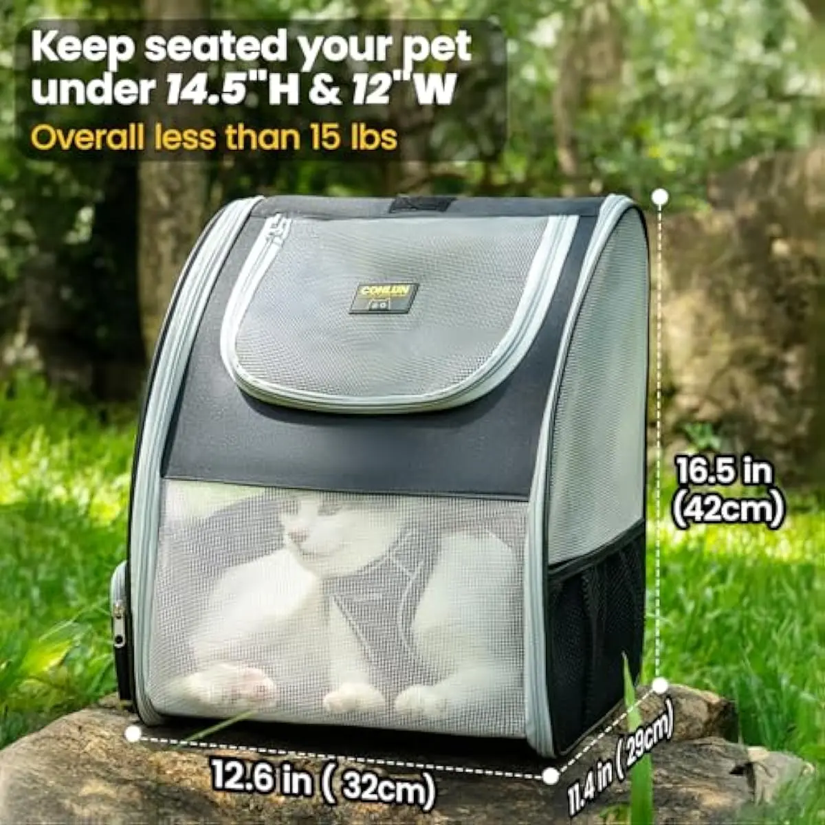 Size Guide:Our pet backpack is optimized for lighter-weight, perfect for small dogs and cats up to 15-pounds.To ensure your pet's comfort, please measure their height (≤14.5 inches / 37 cm) and width (≤12 inches / 30 cm) before purchasing. The right size allows pets to curl up comfortably, while the backpack itself remains lightweight and space-efficient.