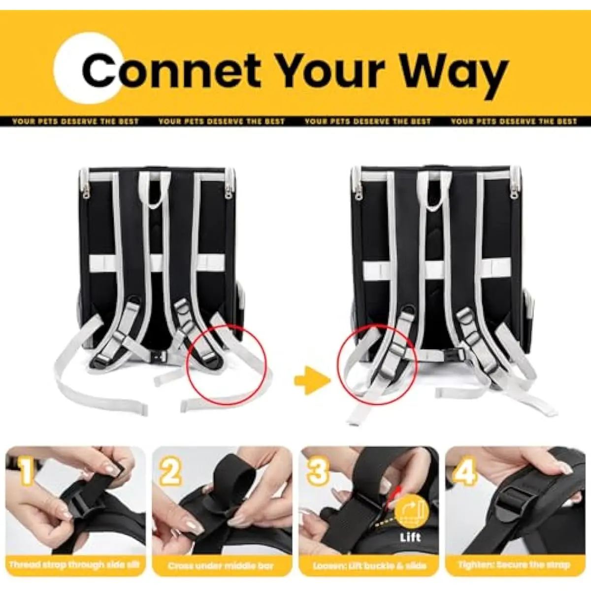 Ergonomic for You:This dog backpack carrier Includes padded, adjustable shoulder straps and a chest buckle to distribute weight evenly and eliminate back strain., it evenly distributes weight for more comfortable long-term wear. The straps require simple installation , allowing you to customize the fit to your body for maximum comfort. They can also be quickly detached when not in use.