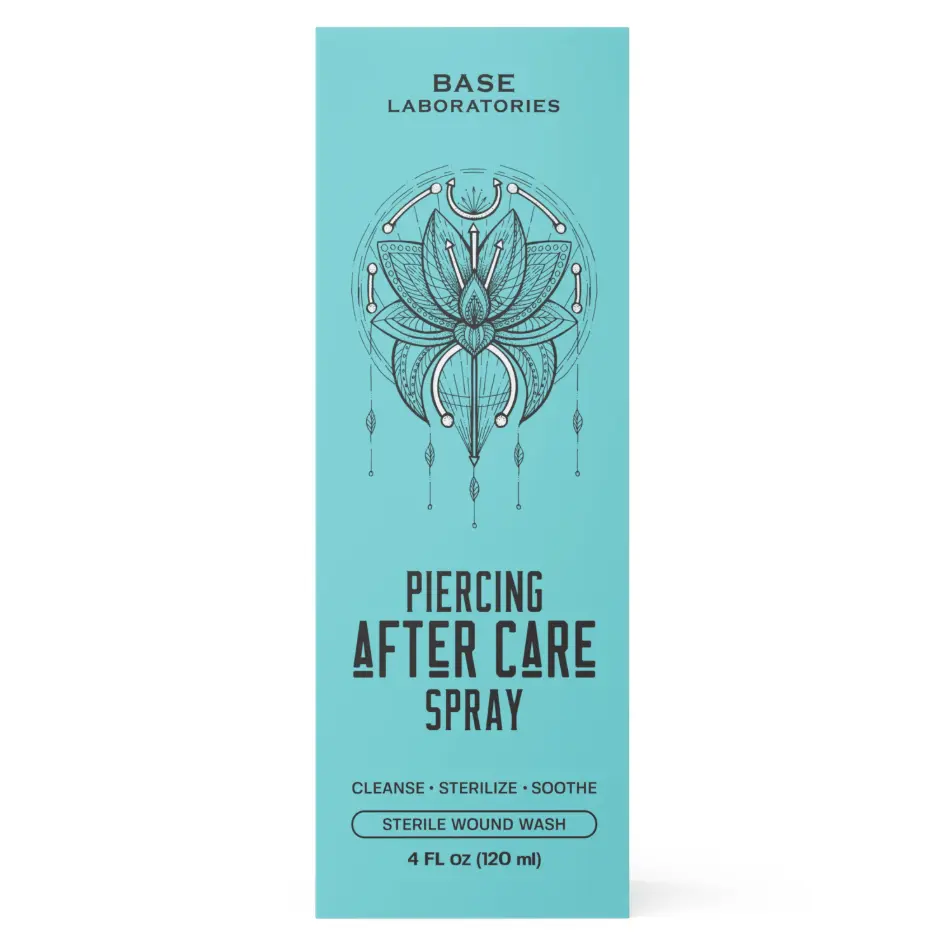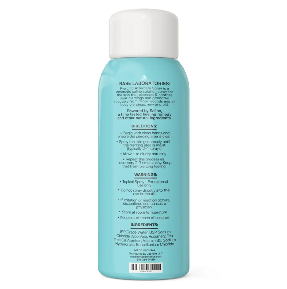 ·ALL NATURAL PIERCING AFTERCARE SPRAY - Base Labs piercing aftercare spray for new and existing piercings is powered by our Isotonic Saline Solution. Use as a cleanser and saline spray for piercings, bumps and keloids on the Ear, Nose, Belly Button, Earrings, Tattoo Aftercare, Wound Wash and more.