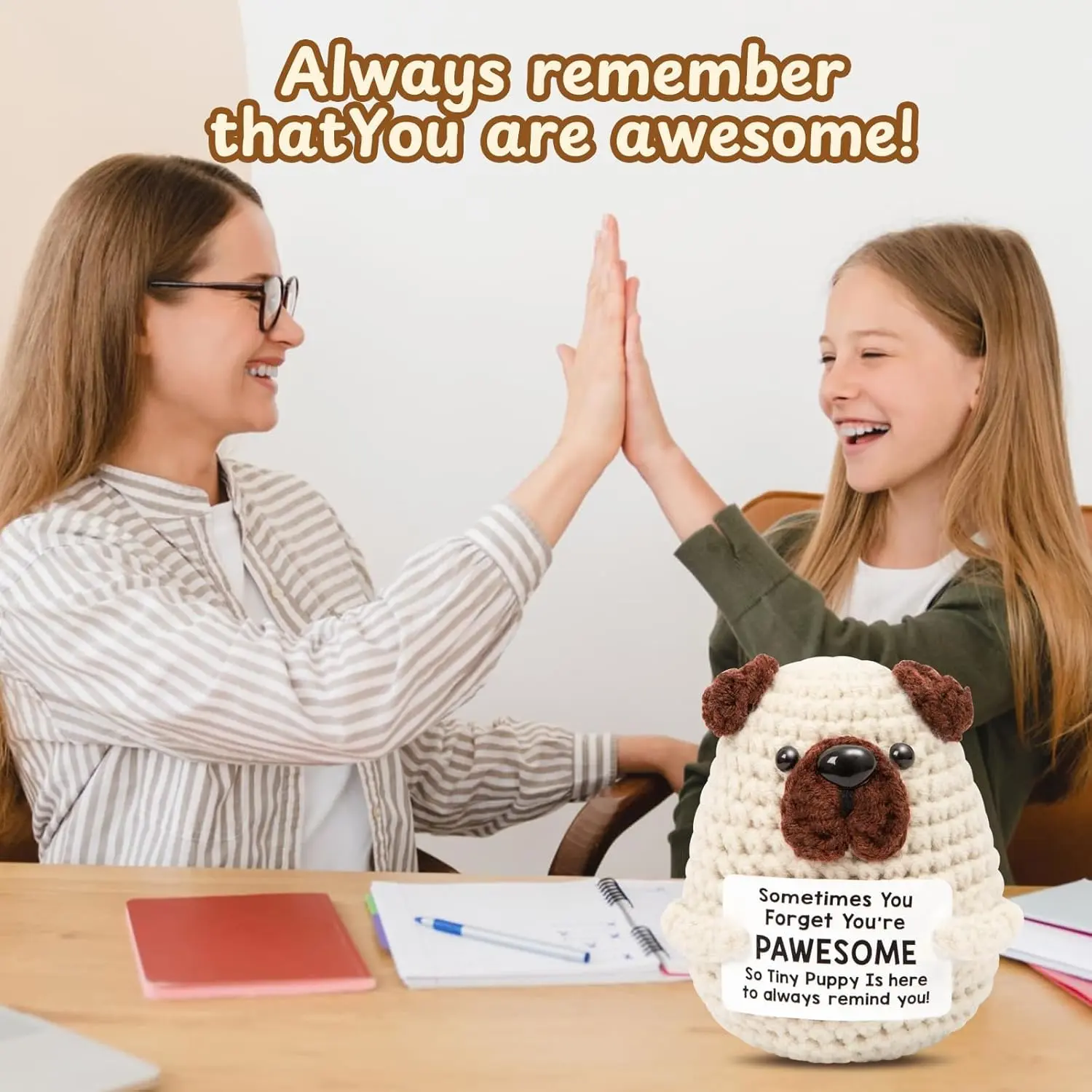 Mini Positive Crochet Dog, Handmade Emotional Support Puppy with Inspirational Message Card, Cute Stuffed Animal for Stress Relief & Encouragement, Heartwarming Gift for Friends Family
