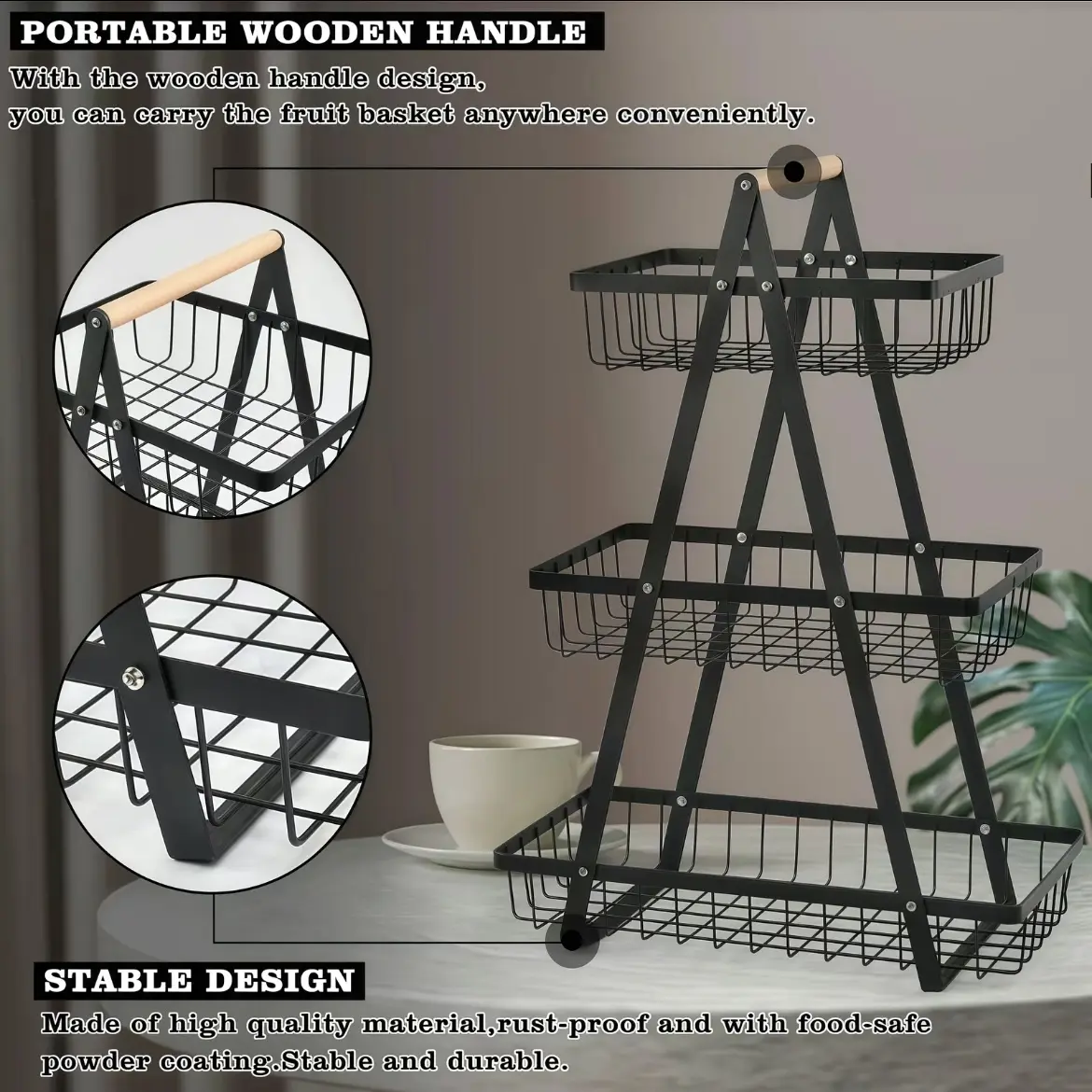 Elevate your kitchen with this 3-Tier Fruit Basket Stand. It features a wooden handle for easy mobility and a metal wire storage rack for versatile use. Perfect for fruits, bread, snacks, and vegetables, this organizer maximizes your kitchen counter space. Its large capacity ensures you have ample storage for all your essentials.