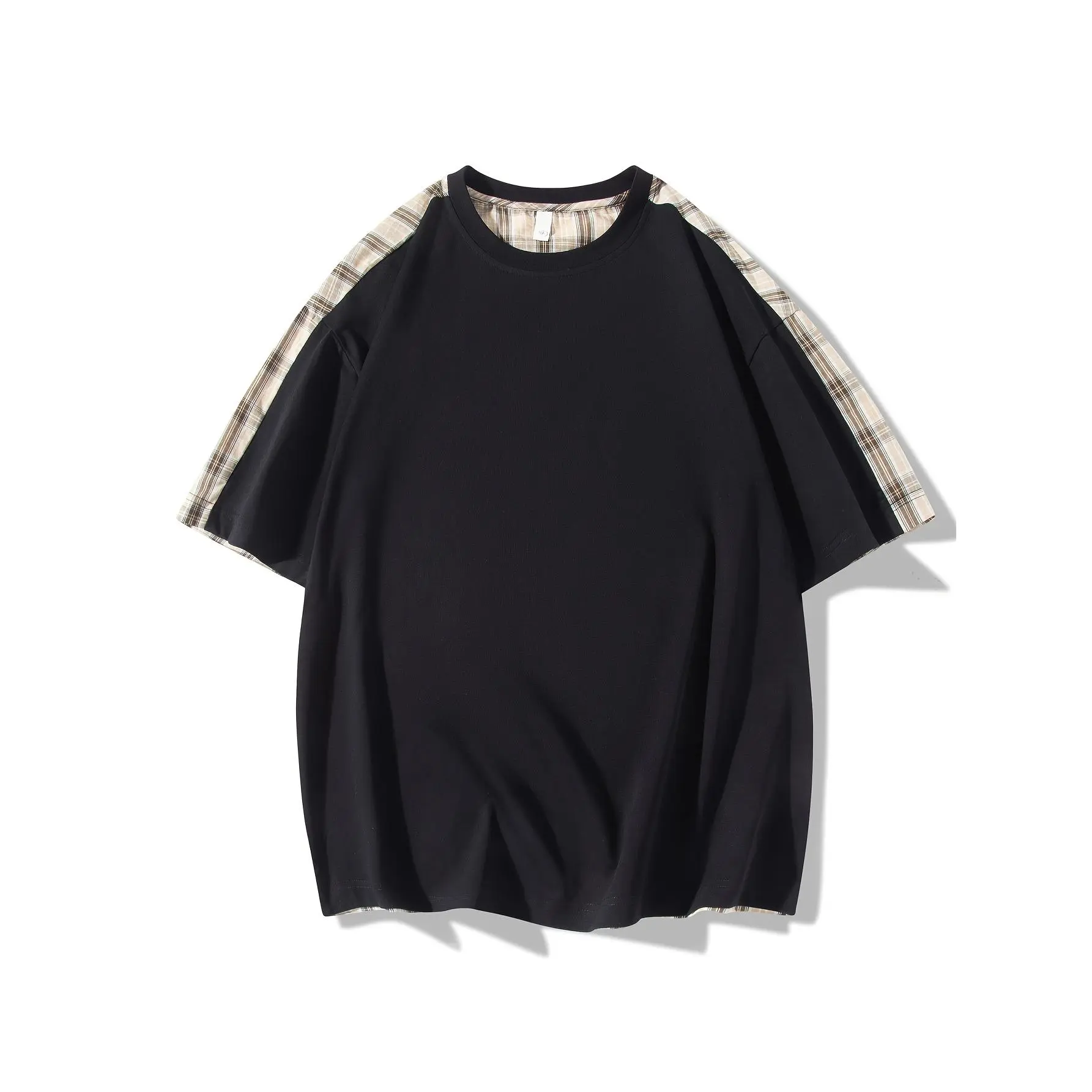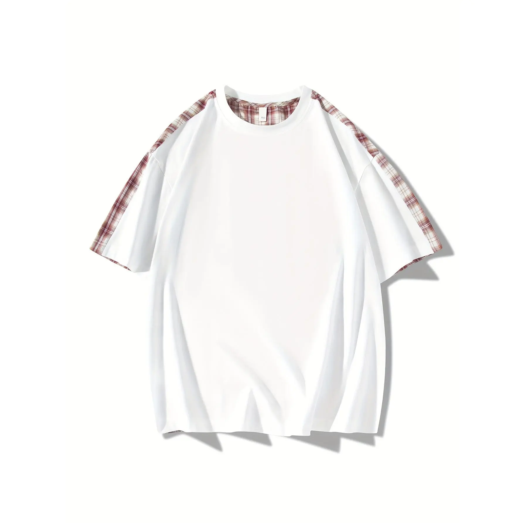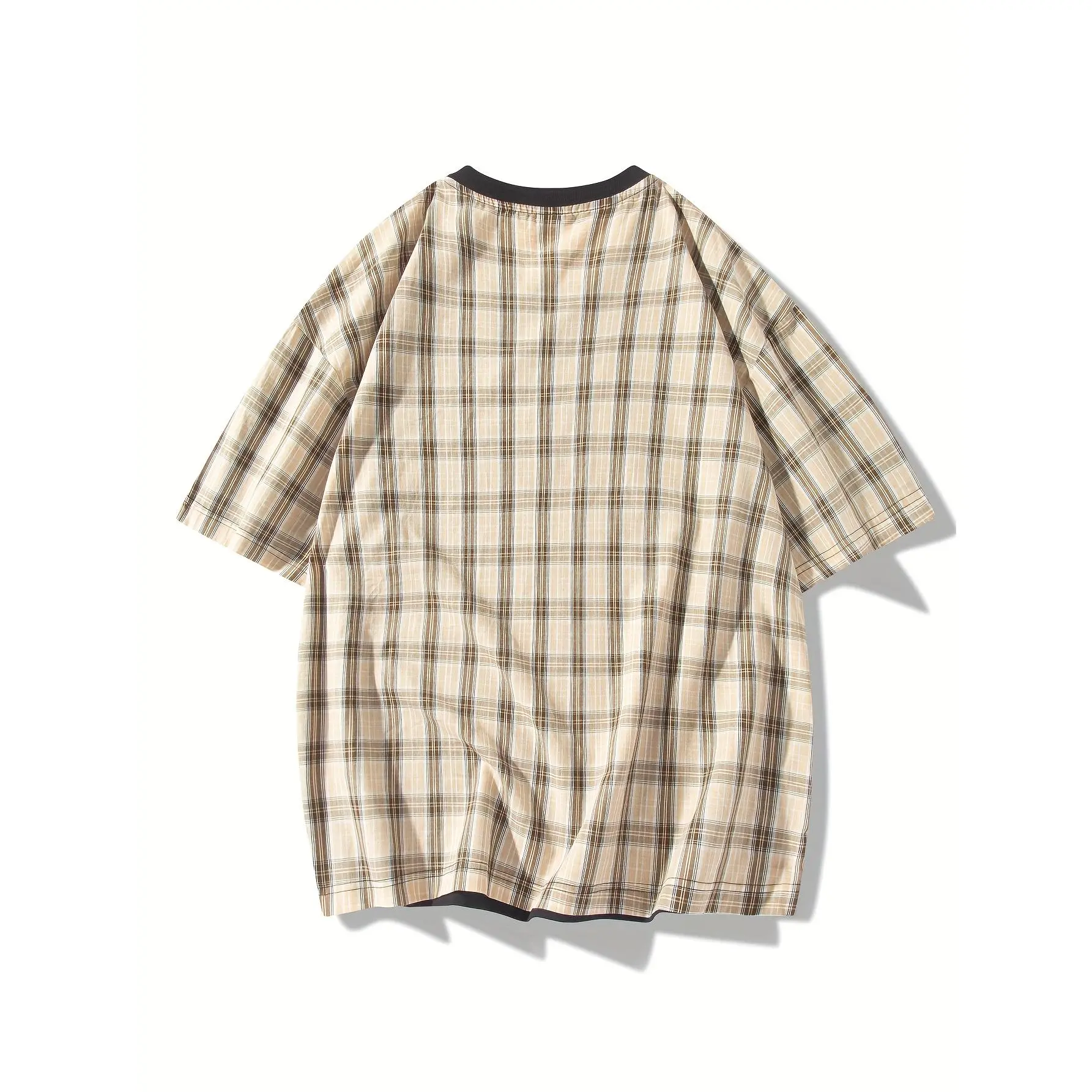NewBdhjydb Men'S Casual Plaid & Solid Color T-Shirt - Short Sleeve, Round Neck, Lightweight Polyester Blend, Summer Streetwear with Contrast Sleeves, White with Brown/Beige/Black/White Check Pattern, Perfect for Casual Attire, Everyday Tshirt| Contrast