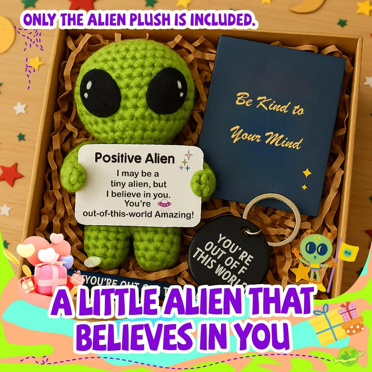 Positive Alien Crochet Plush with Inspirational "You're Out-of-This-World Amazing" Message Card, Handmade Emotional Support Desk Decor, Funny Motivational Gift for Teens Friends Coworkers, Ideal for Valentines, Easter Basket Stuffers, Birthday & Graduatio