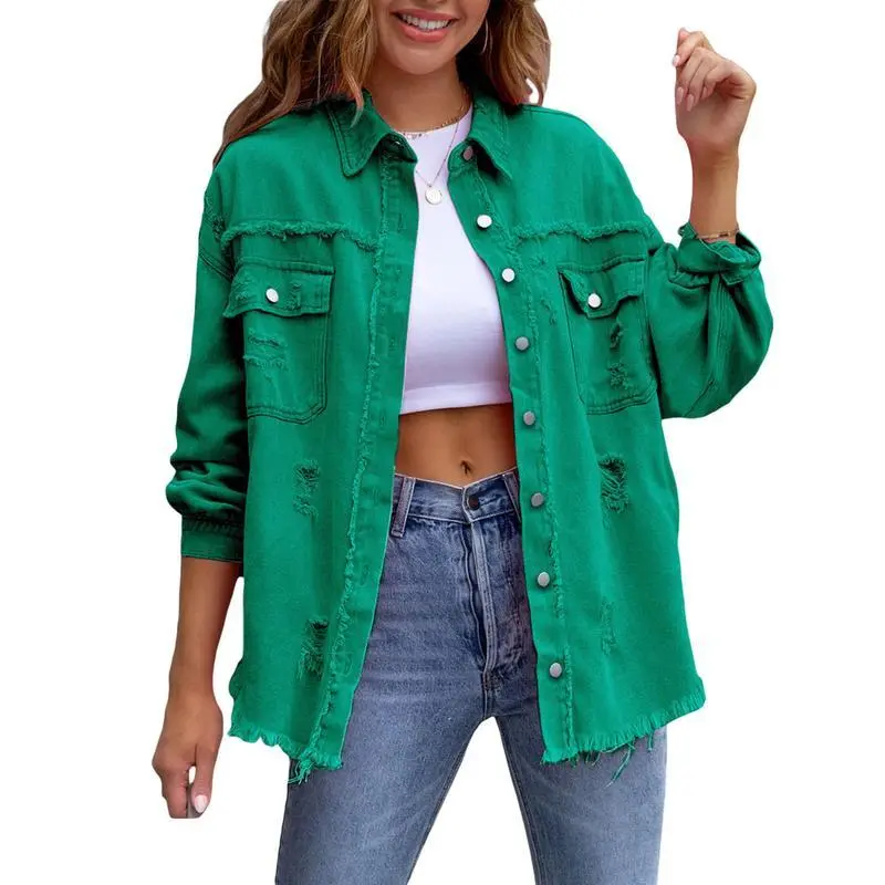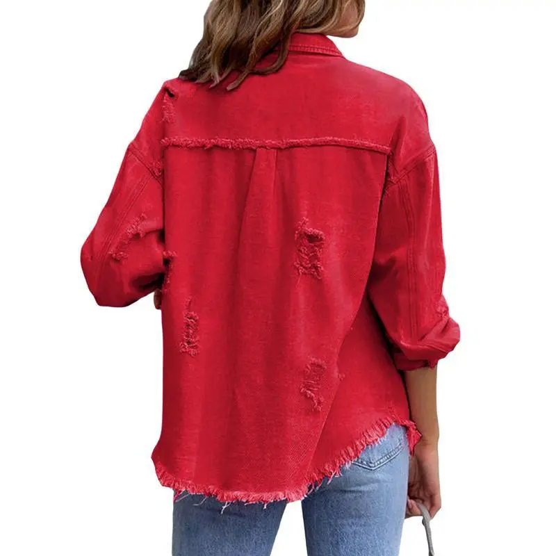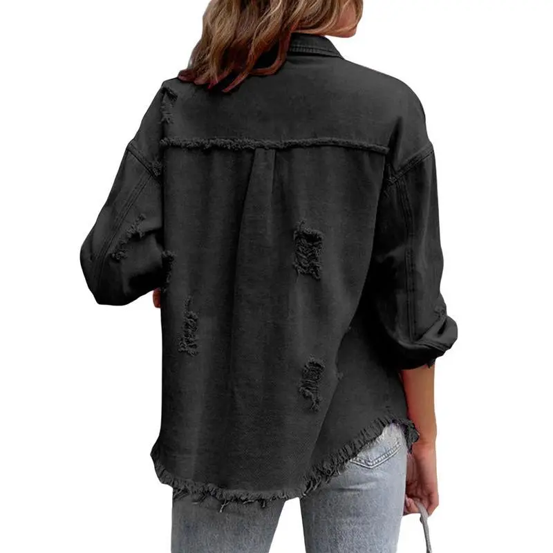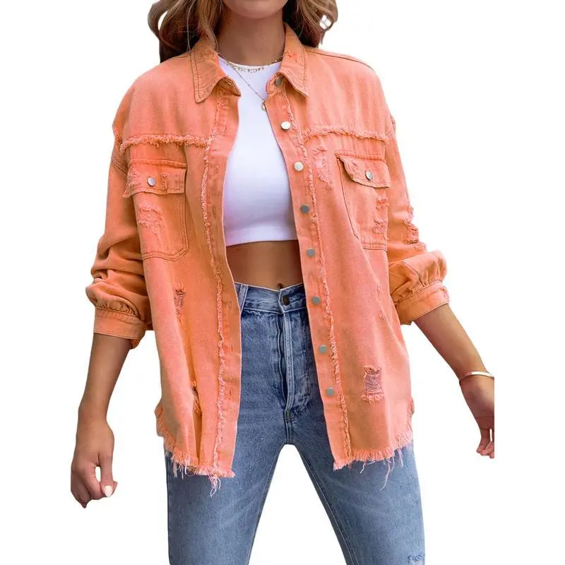 Women's Ripped Distressed Denim Jacket Long Sleeve Button Down Boyfriend Jean Coat Trucker Jacket Jean Jacket Frayed Washed Button Up Denim Jacket With Pockets Basic Casual Everyday Outerwear Womenswear Lady