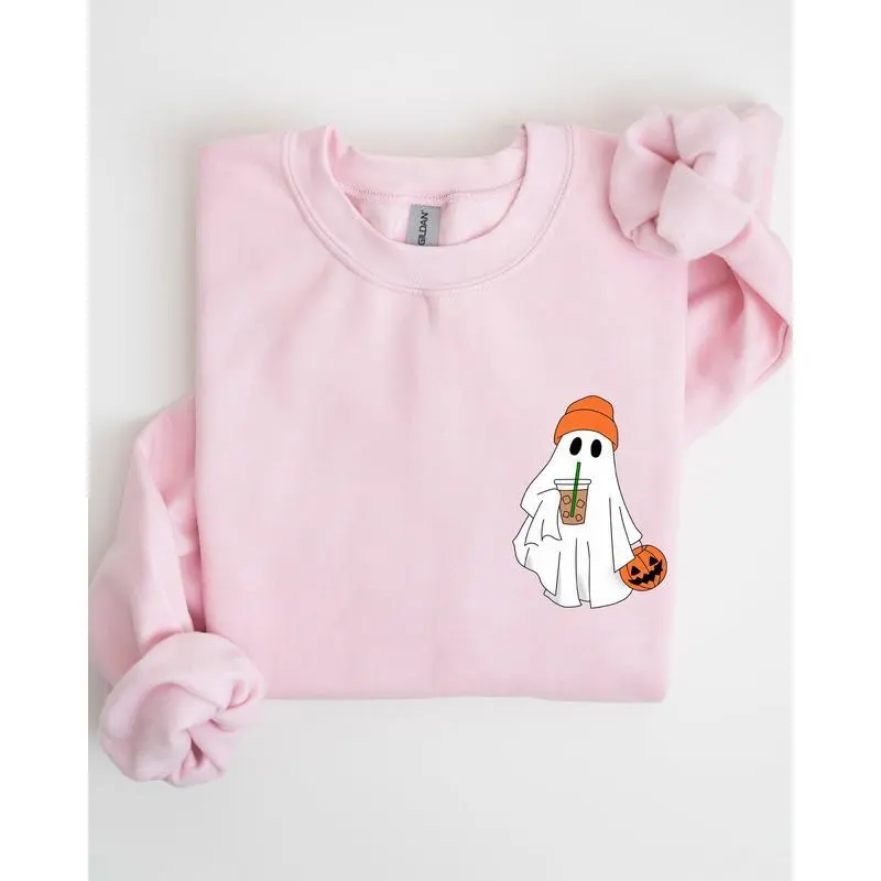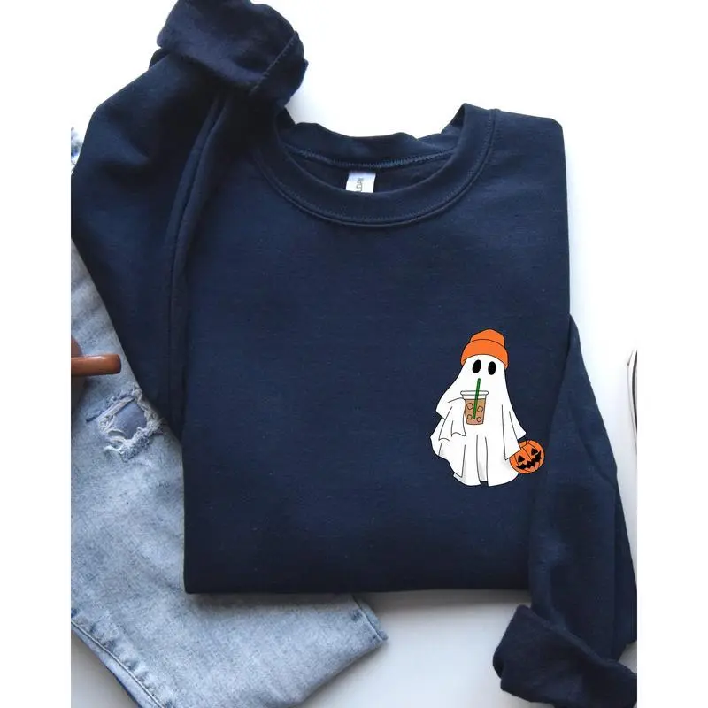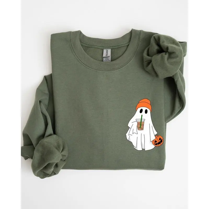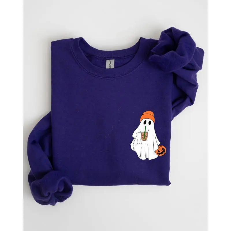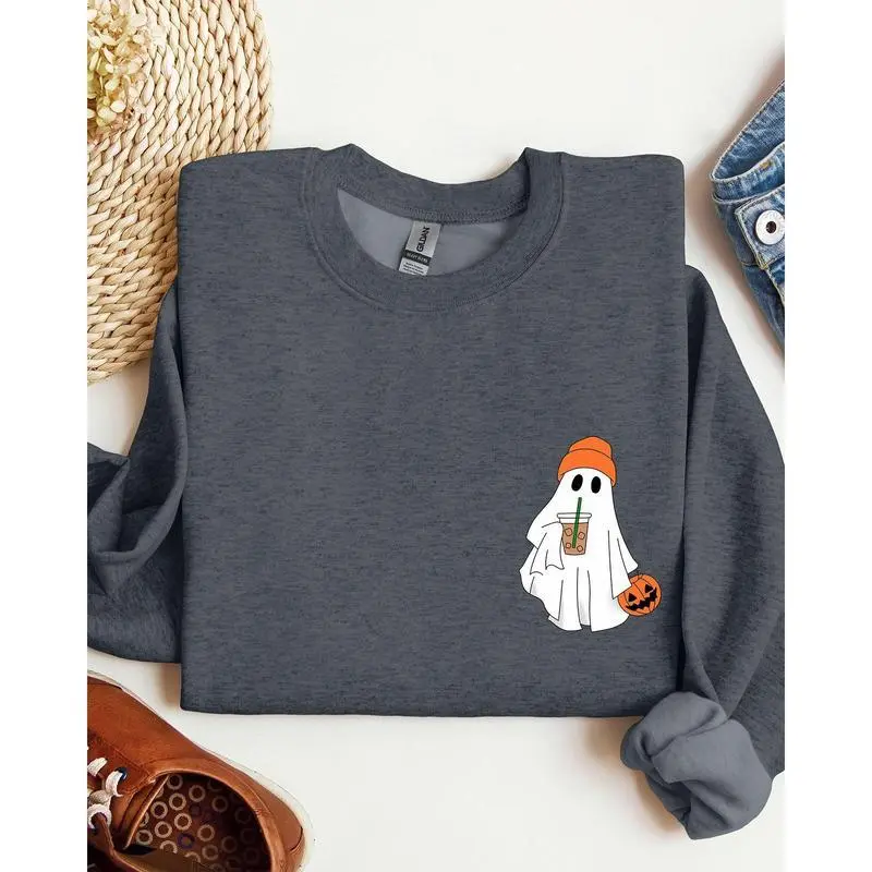 Care Instructions: Machine washable, tumble dry low How to Wear This Cute Skater Ghost, Pocket Print, Halloween, Coffee, Trick or Treat Sweatshirt pairs perfectly with your favorite jeans for a relaxed yet trendy look. Layer it over a tee for a stylish ensemble, ideal for both casual outings and cozy nights in.
