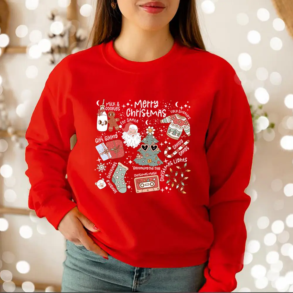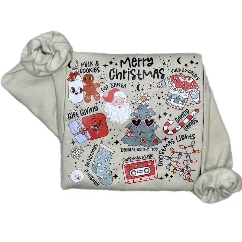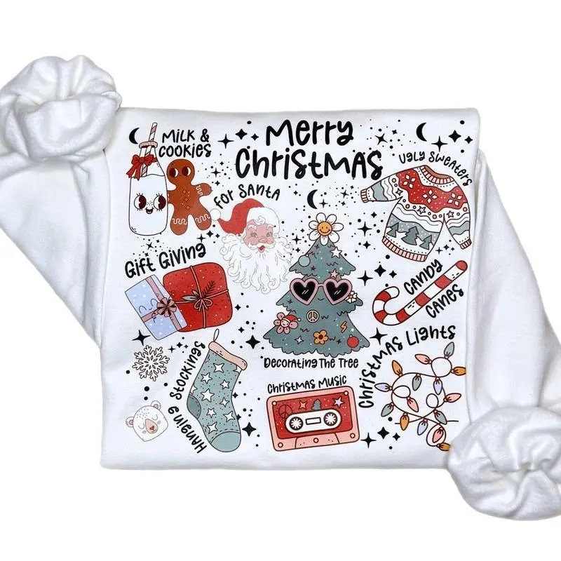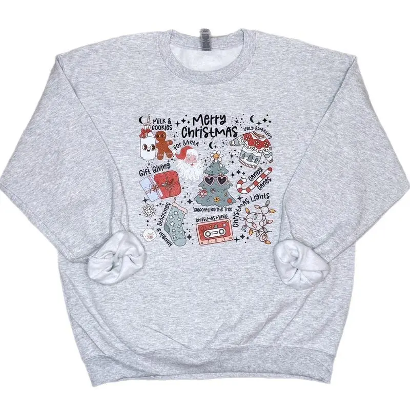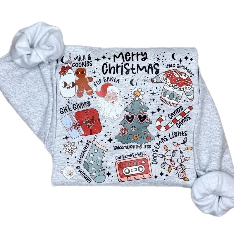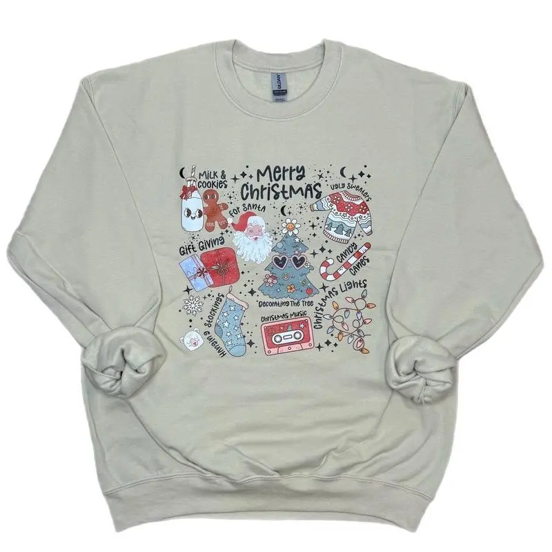 The cutest Christmas sweatshirt showcasing all your Christmas time favorites!! Made by our small business in Mississippi! ? Gildan Heavy Blend Crewneck Sweatshirt ? 50% Cotton, 50% Polyester ? Direct To Film Print ? Unisex fit ? Fits true to size. We recommend sizing up if you are wanting an oversized fit. Turn the sweatshirt inside out. Machine wash cold with mild detergent. Tumble dry low heat. Do not use bleach. Do not iron directly on design. Our garments are pre-shrunk during the garment dye and wash processes for almost no shrinkage at home.
