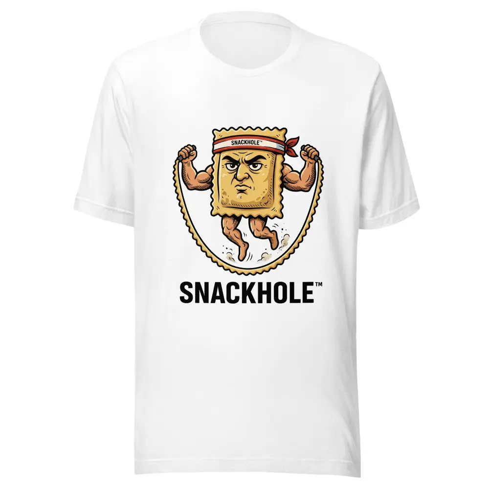 A furious ravioli with biceps skipping rope in a SNACKHOLE headband. He doesn't skip leg day. He IS leg day. This is the most aggressive pasta you've ever seen on a shirt.