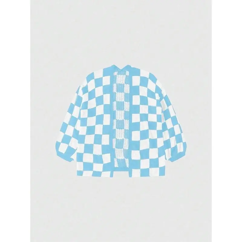 Women's Checkerboard Print Bishop Sleeve Open Front Cardigan, Fashion Casual Long Sleeve Knitwear for All Seasons, Women's Knit Clothing for Daily Wear, Cardigan for Women