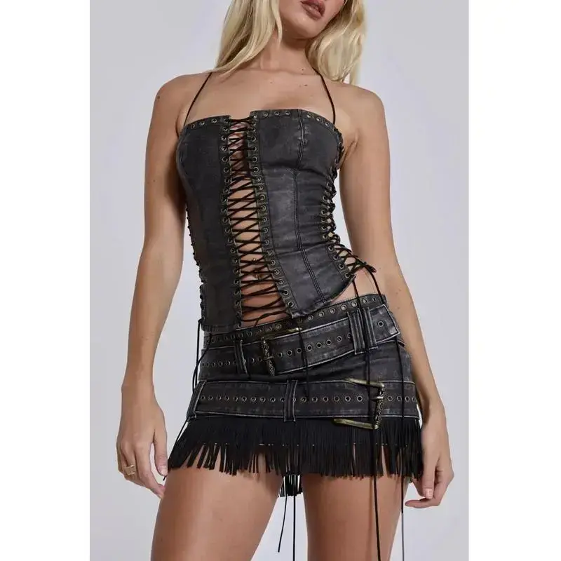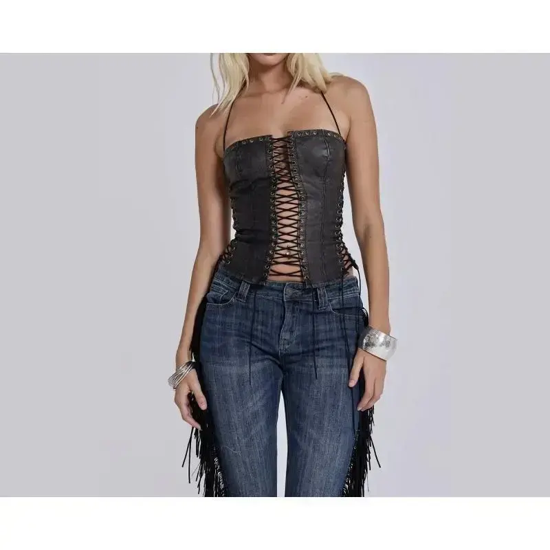 Hollow Out Strap Leather Bustier Vest Dark Y2K Style Hot Girl Camisole Tube Top Womenswear Basic