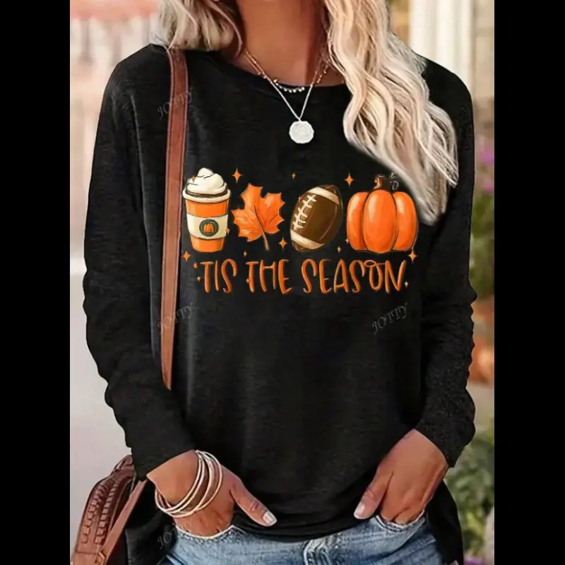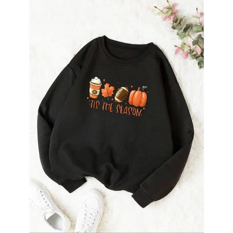 Women's Pumpkin & Letter Print Drop Shoulder Sweatshirt, Casual?Thermal Lined?Long Sleeve Round Neck Pullover for Fall & Winter, Ladies Clothes for Daily Wear, Halloween