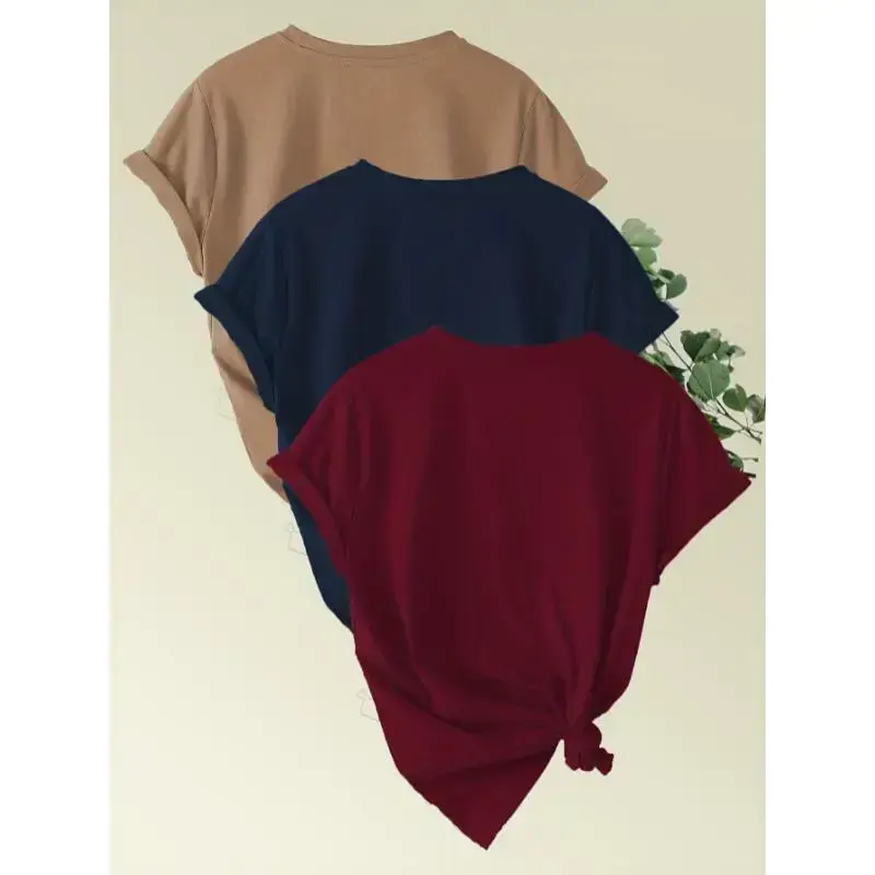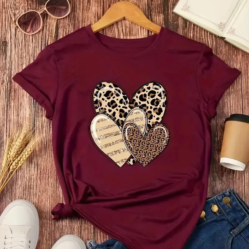3-Pack Women'S Heart Print Short Sleeve T-Shirts, Casual Crew Neck Polyester Tops, Spring/Summer Knit Fabric Pullovers, Womenswear Collar Tshirt Crewneck Batwing Camel + Navy + Burgundy Streetwear Fitted Shortsleeve