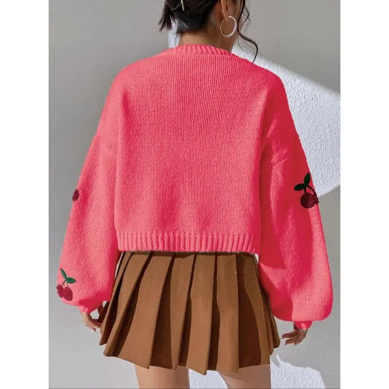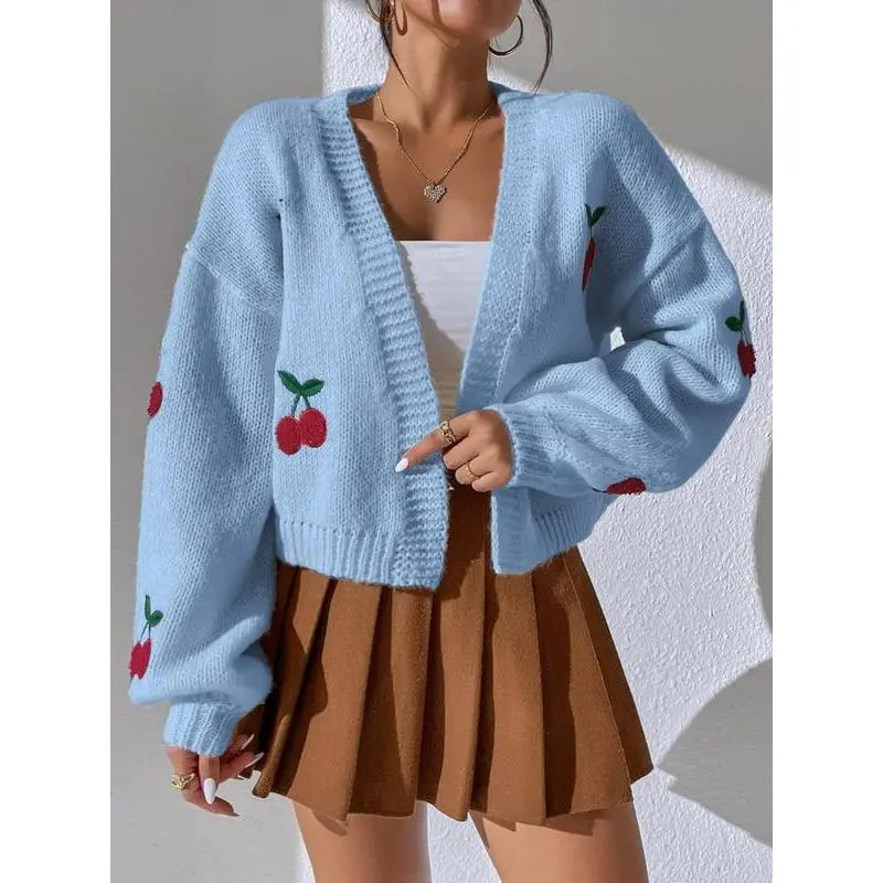 【Plus Size】 Cherry Embroidery Drop Shoulder Open Front Cardigan, Casual Long Sleeve V Neck Knitwear for Spring & Fall, Women's Plus Clothing for Daily Wear