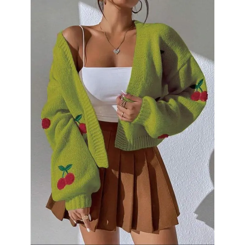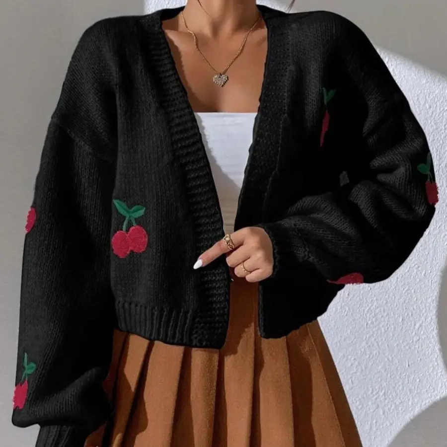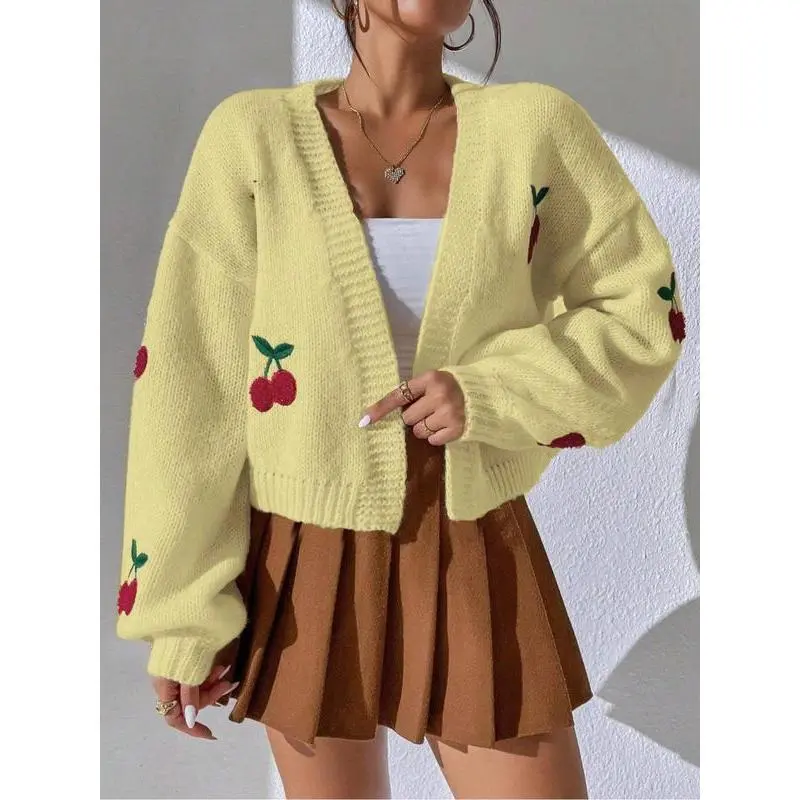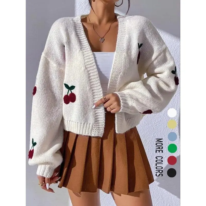 【Unique embroidery】: Features cherry embroidery, offering a one-of-a-kind touch that differentiates it from standard cardigans. 【Loose fit】: This loose-fitting silhouette allows for easy movement and layering, providing flexibility in wear. 【Lightweight fabric】: Crafted from a moderate thickness fabric, it is suitable for spring and fall seasons, ensuring adaptability. 【No buttons】: Designed without buttons, this piece offers a contemporary open-front look that is easy to wear and style. 【Knitted cardigan】: Made from soft knit material, enhancing its casual fabric appeal while retaining warmth during cool weather.