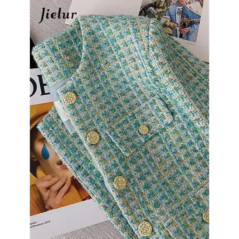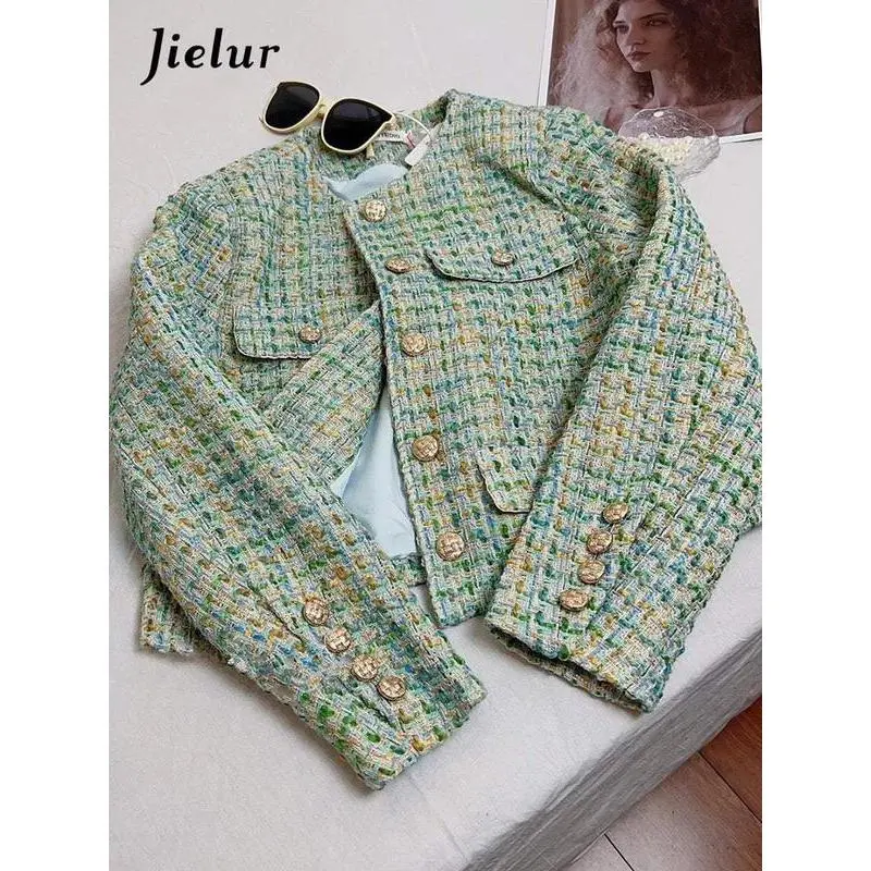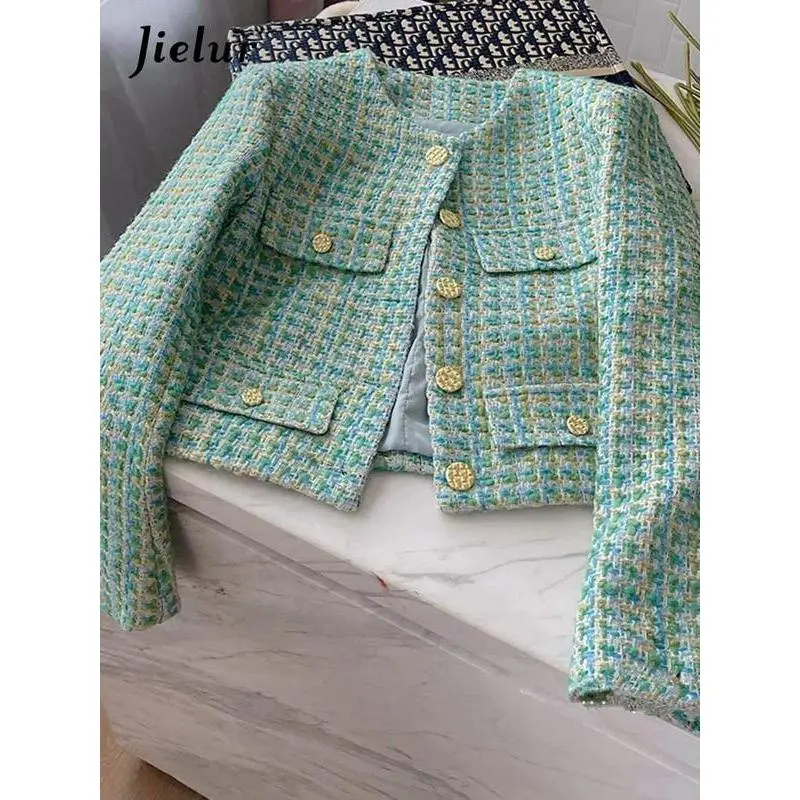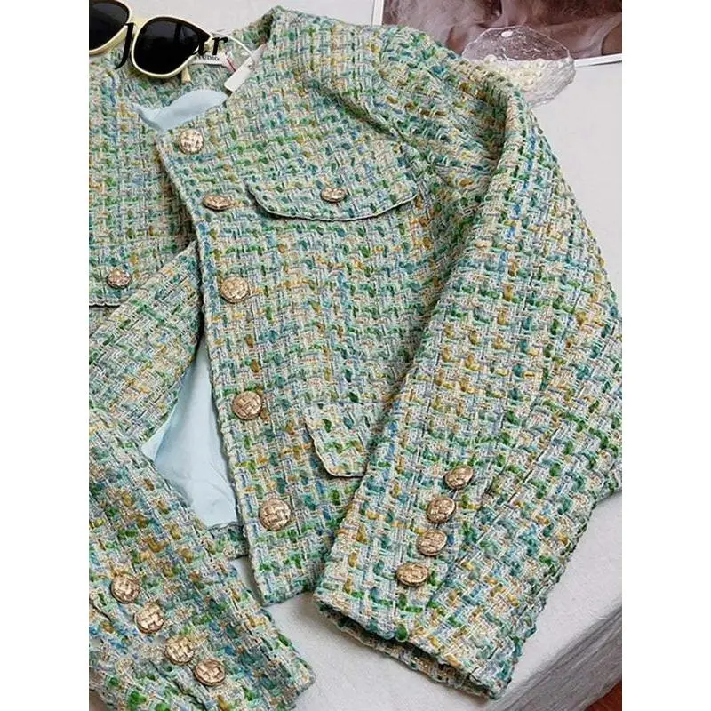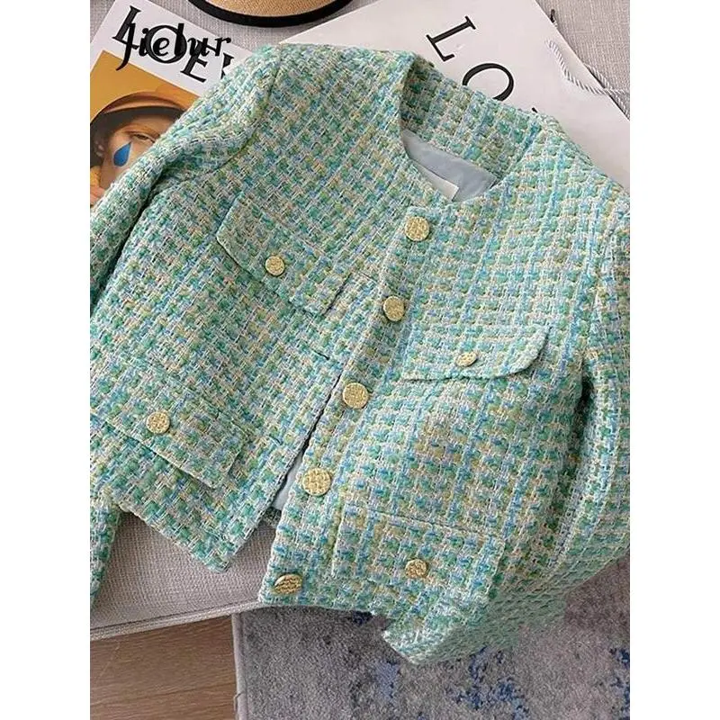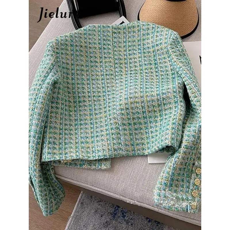 Elegant Luxury Green Plaid Tweed Jacket Women French Vintage New Spring Autumn Casual Blazers High Street Short Suit Coat