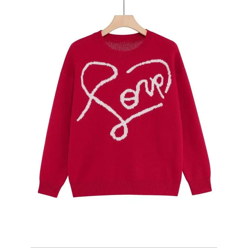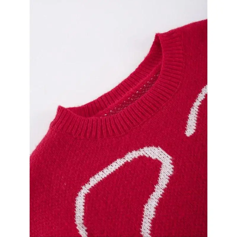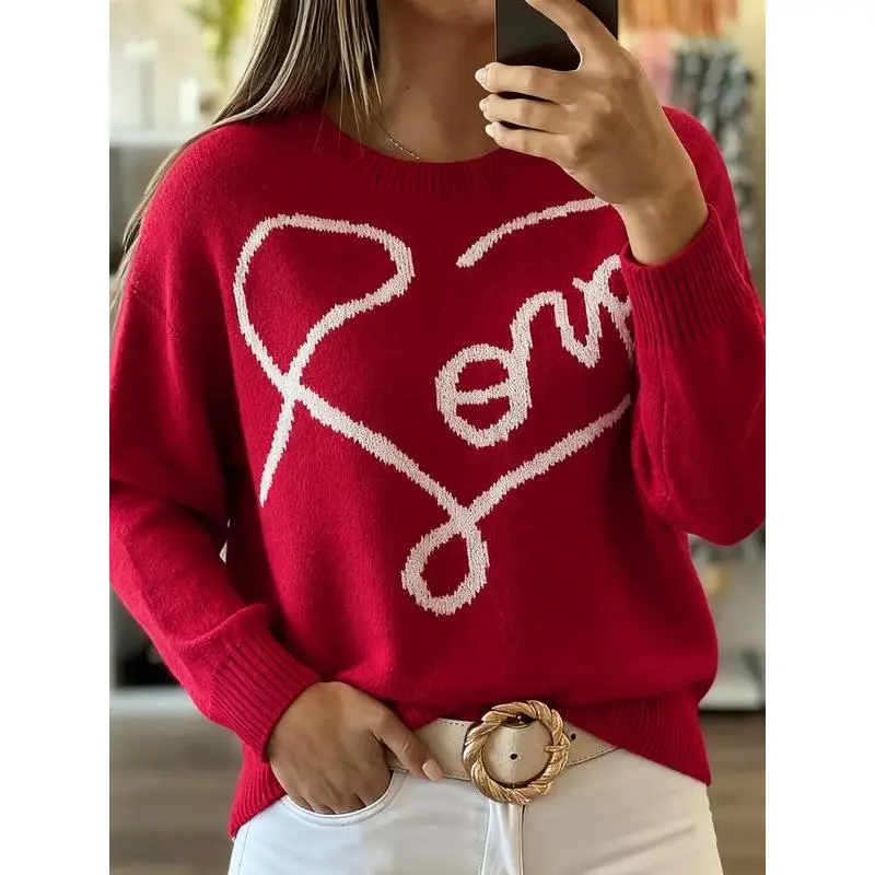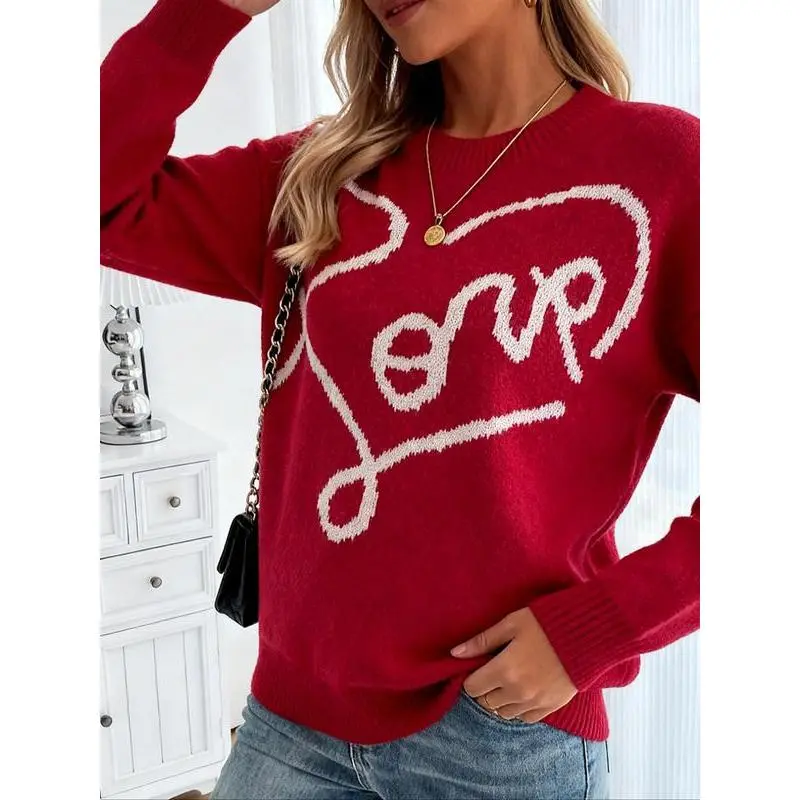 Women's Autumn Winter Heart Letter Embroidered Sweater, Round Neck Long Sleeve Loose Knit Top, Casual Fitted Holiday Shirt