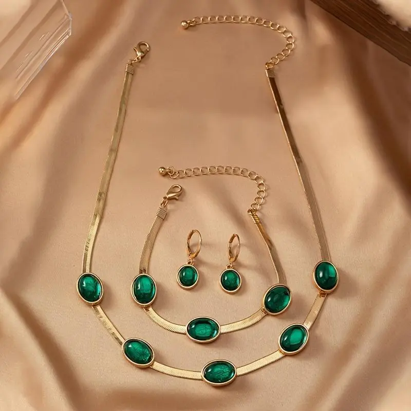 Vintage-inspired jewelry set with gemstone pendant necklace, bracelet & earrings-perfect for casual attire