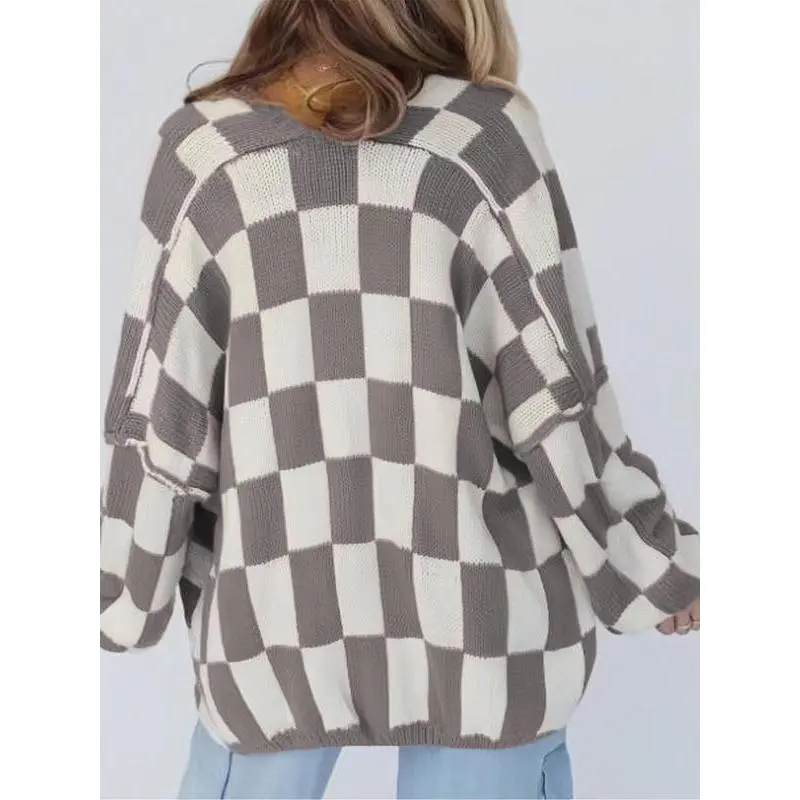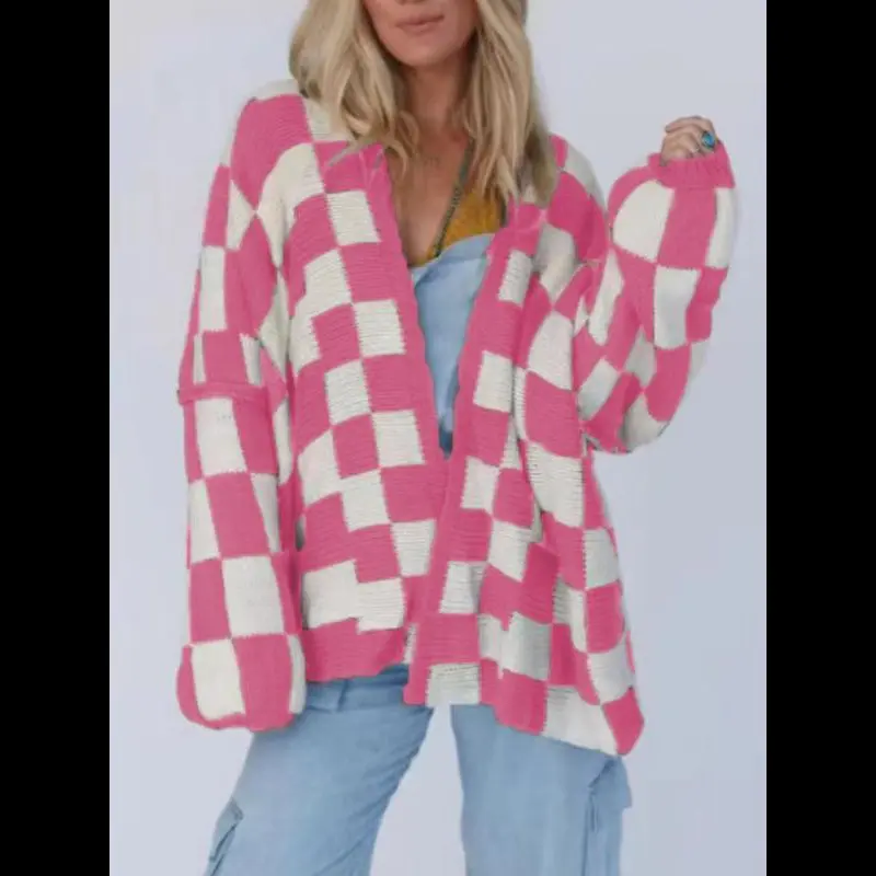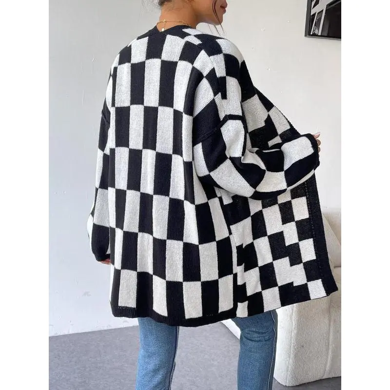 Christmas Deals Women's Checkerboard Pattern Drop Shoulder Cardigan, Casual Long Sleeve Open Front Knitwear for Summer, Fashion Ladies' Knit Clothing for Daily Wear, Christmas 2024 Trend, Fall&winter Clothing
