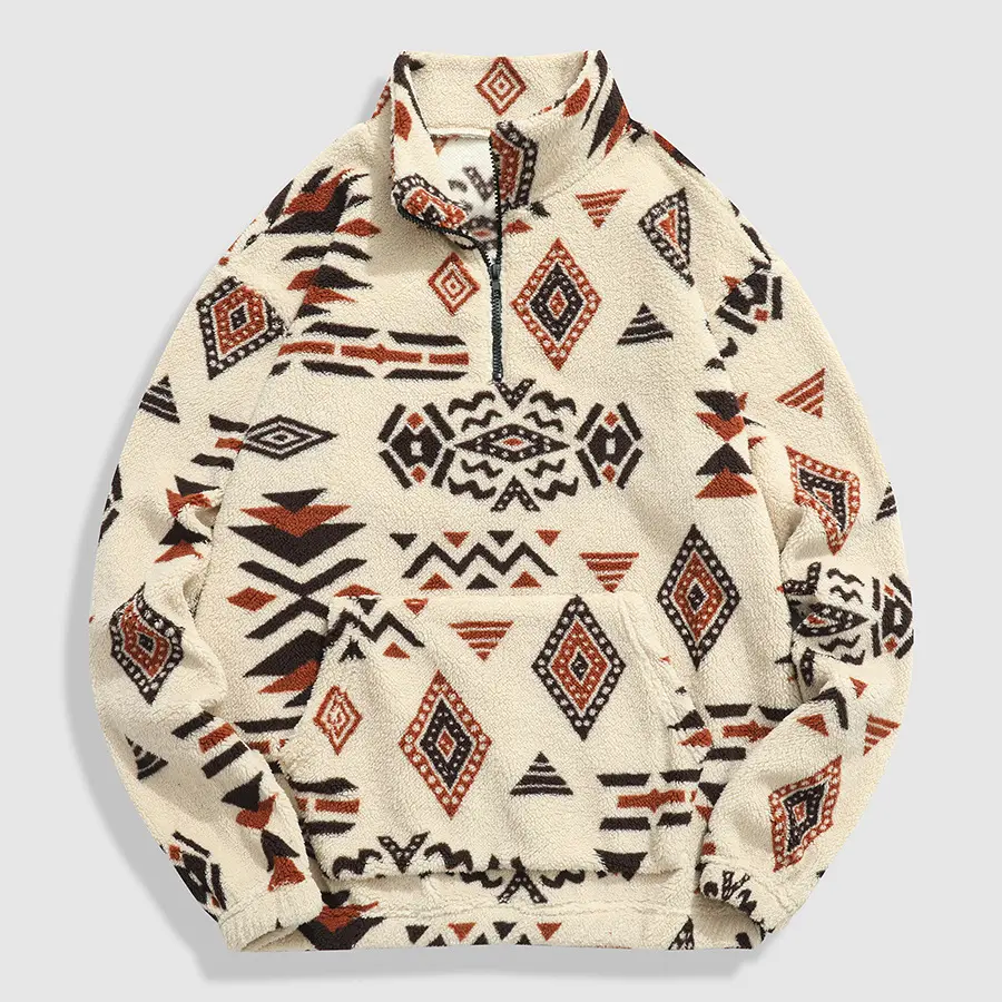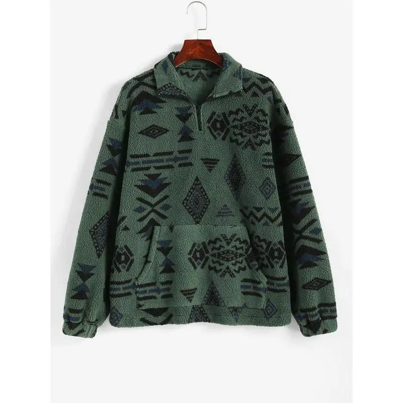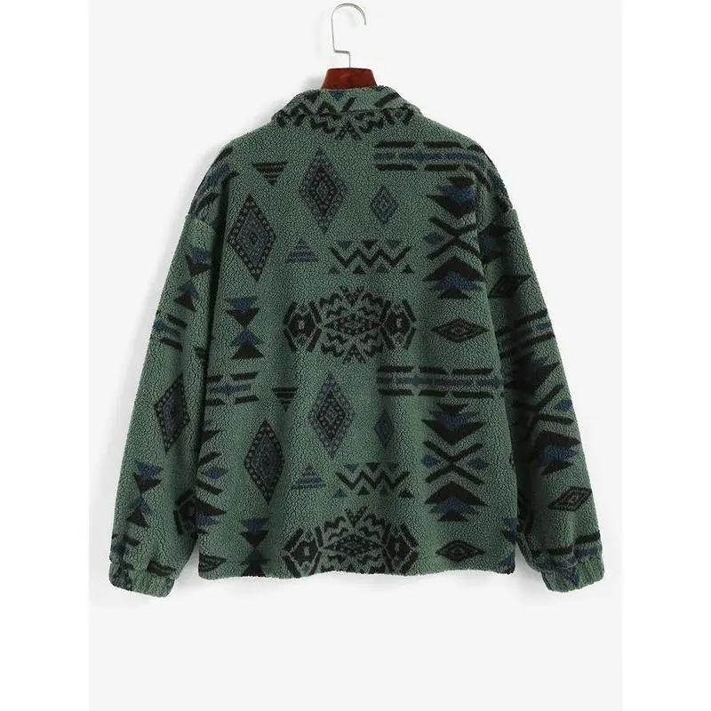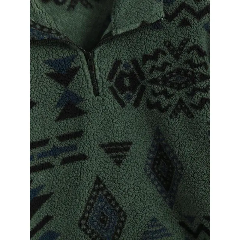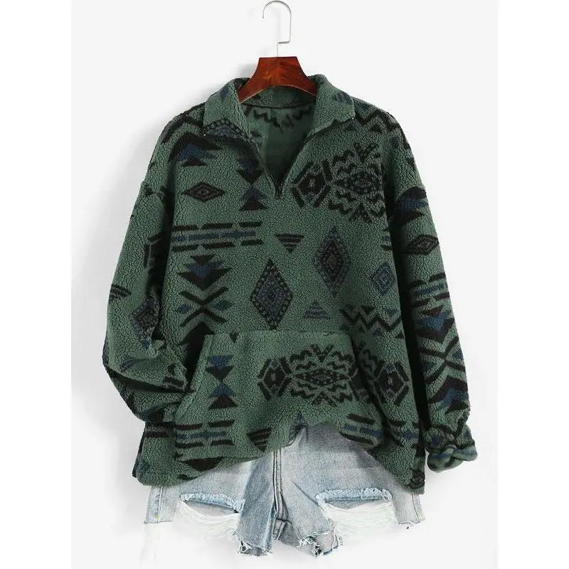 Women's Tribal Print Drop Shoulder Pocket Zipper Plush Sweatshirt, Casual Long Sleeve Collared Teddy Top For Fall & Winter, Women's Clothes For Daily Wear