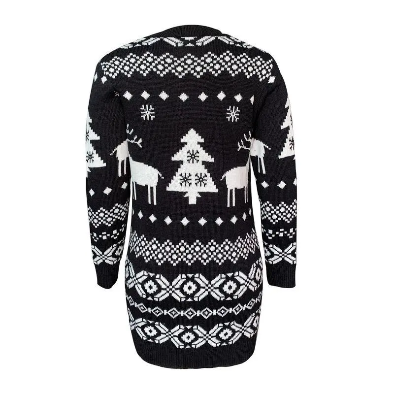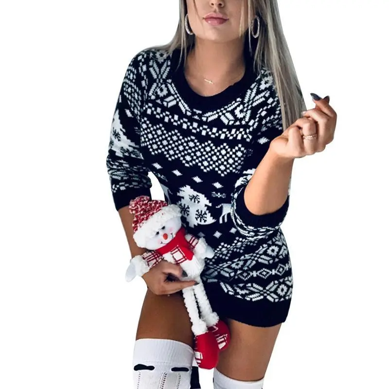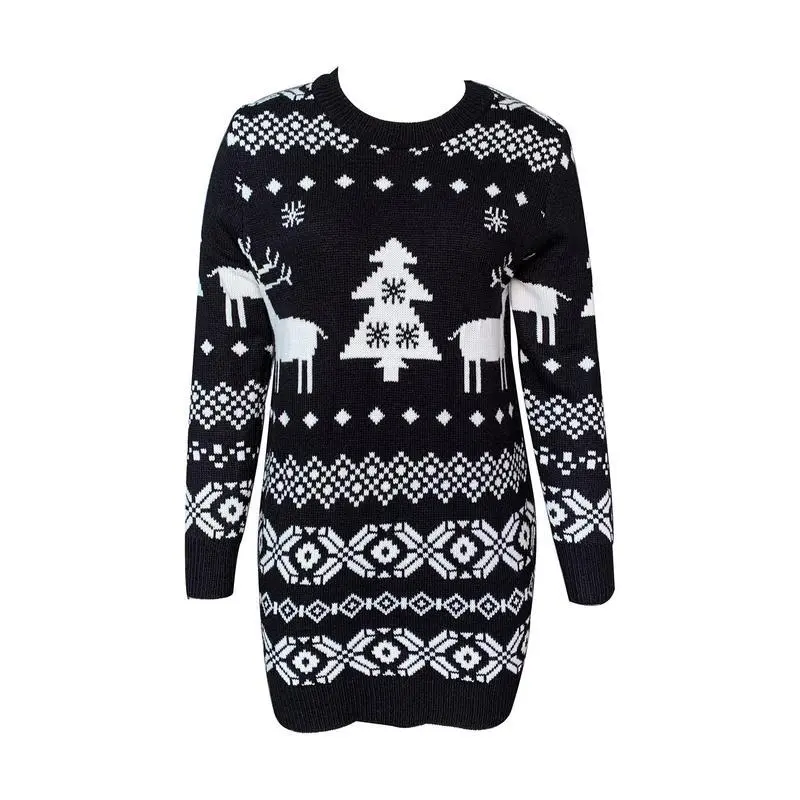 Female Knitted Dress, Christmas Floral Print Round Neck Long Sleeve for Women, Black/Red 2024 Autumn Winter New Style Women's Long-Sleeved All-Match Christmas Theme Knit