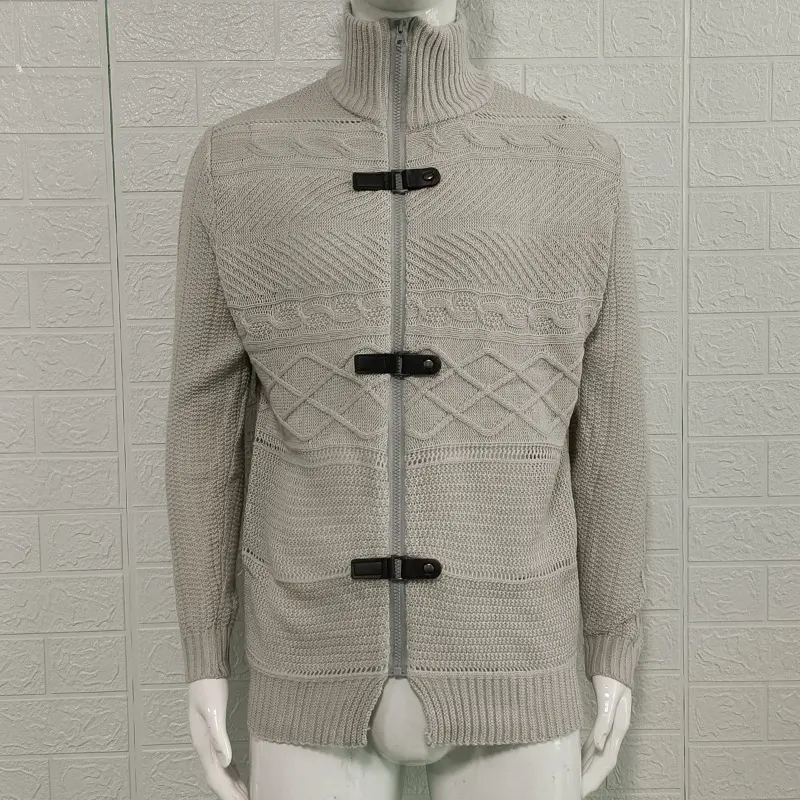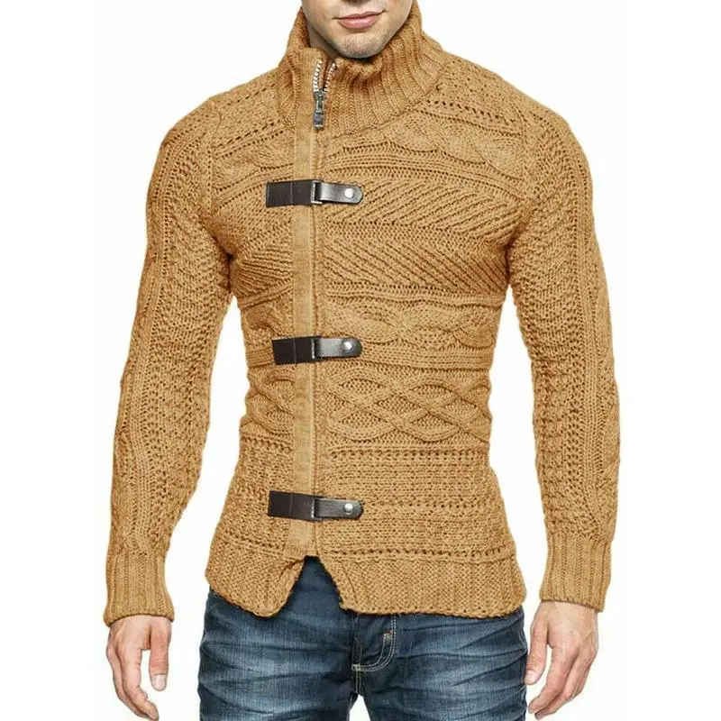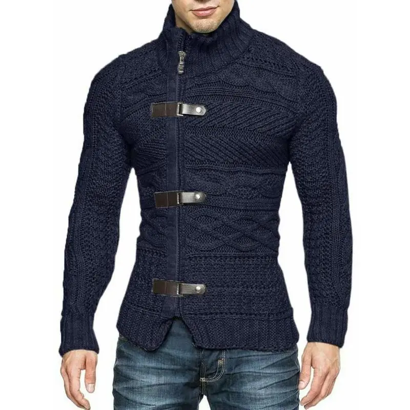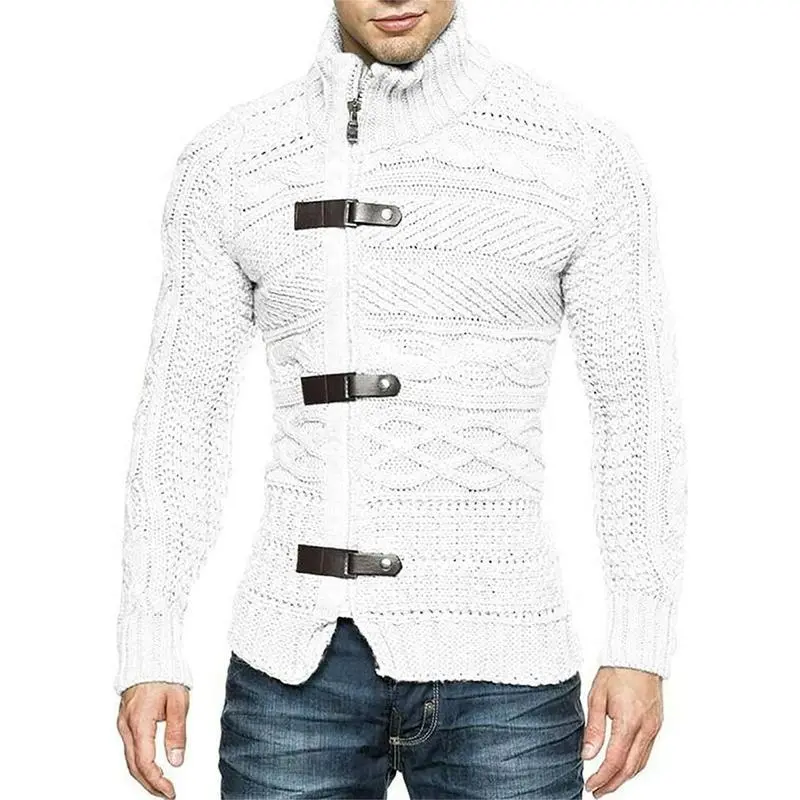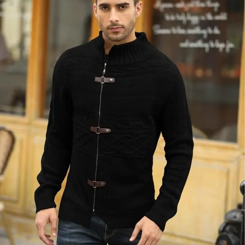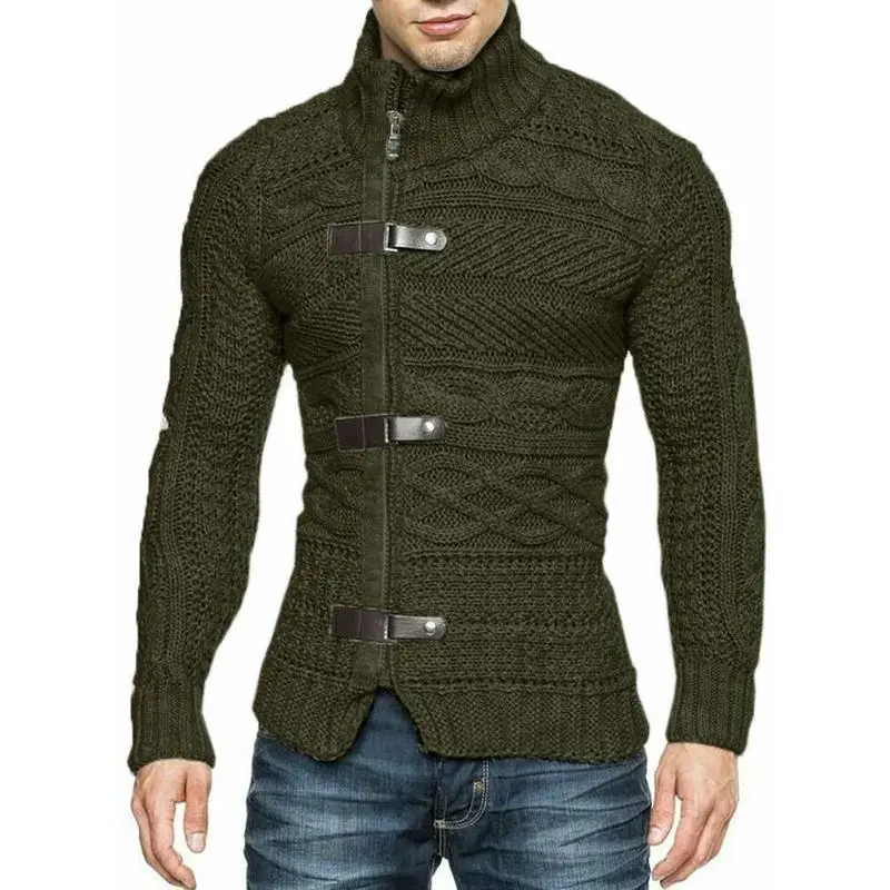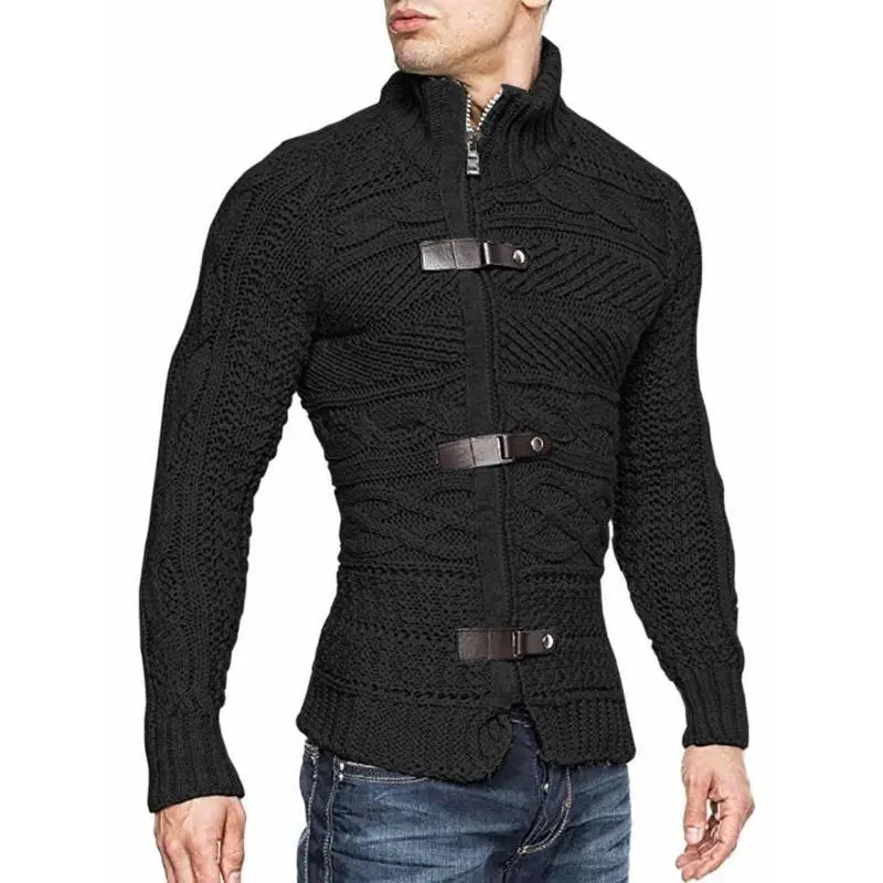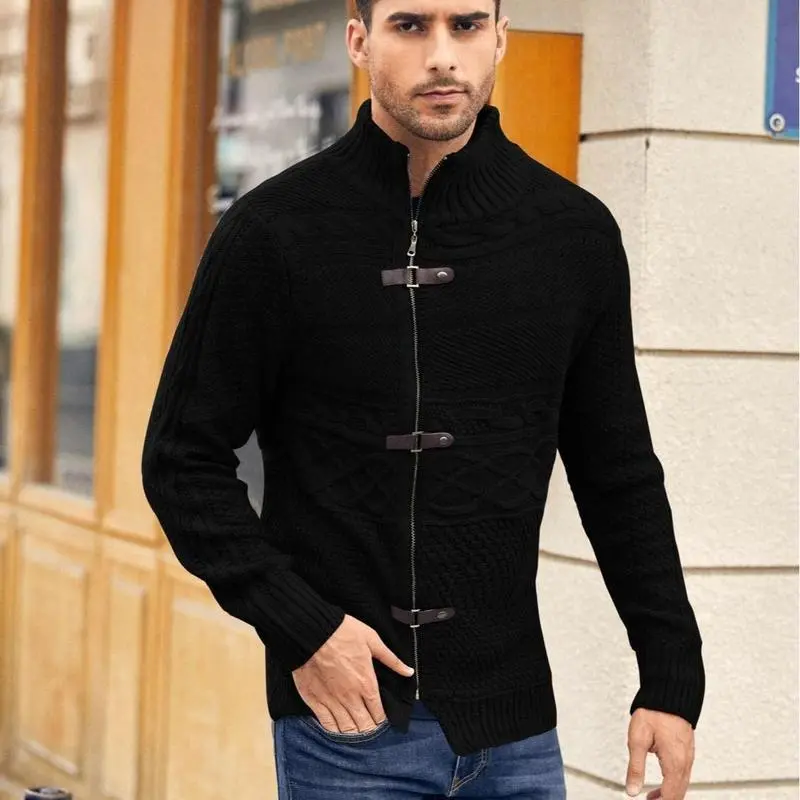 PASLTER Men's Cable Knitted Oplique Zip Button Front Long Sleeve Cardigan Sweater Leather Outfit Zipper Jacket