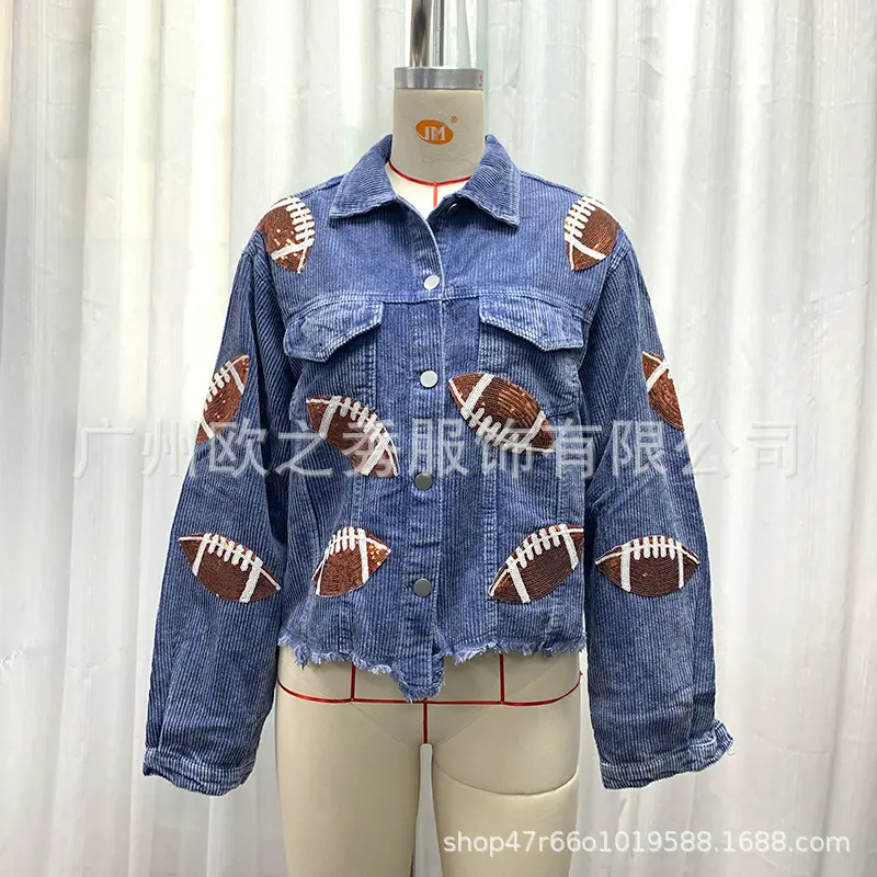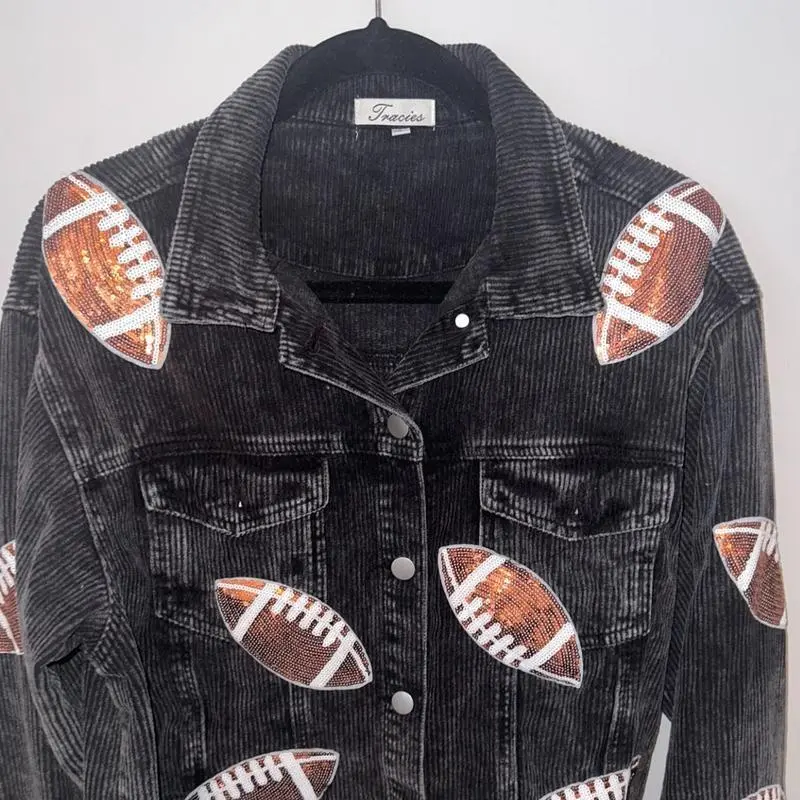 This Jacket Is a beauty True to size. Corduroy Jacket with Football Sequin Patches.
