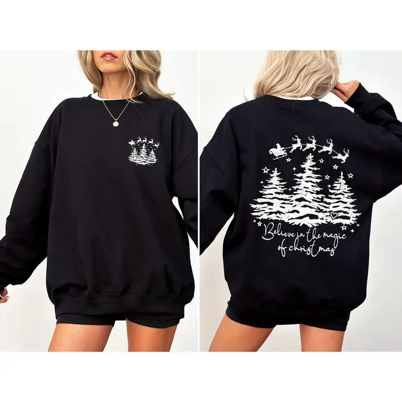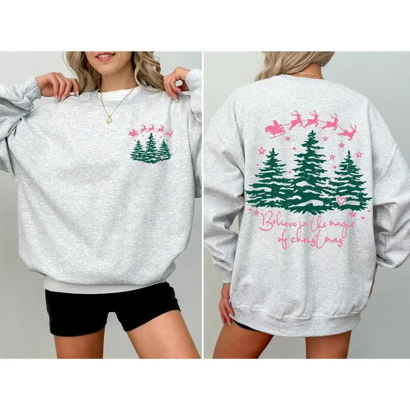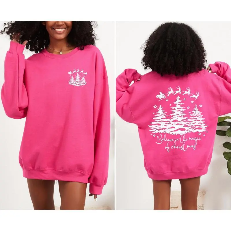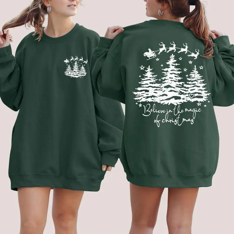 Believe In The Magic Of Christmas, Santa, Front and Back, Christmas Trees, Winter, Snow, Xmas Sweatshirt, Women's Crew Neck, Crewneck