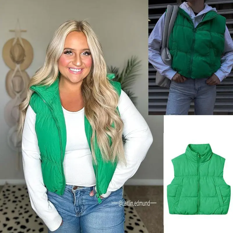 Womens Cropped Puffer Vest Zip Up Stand Collar Lightweight Sleeveless Padded Gilet with Pockets