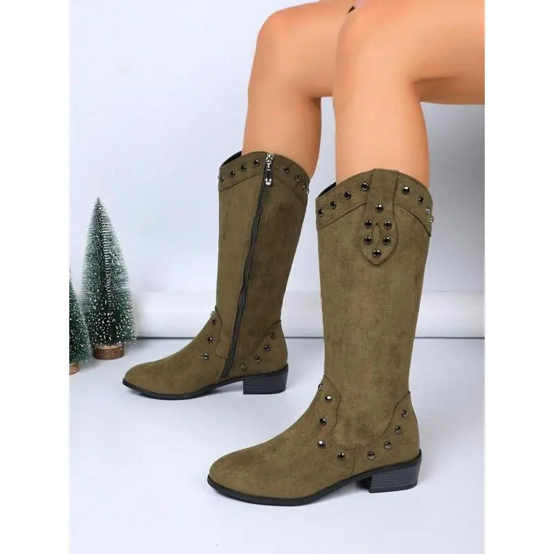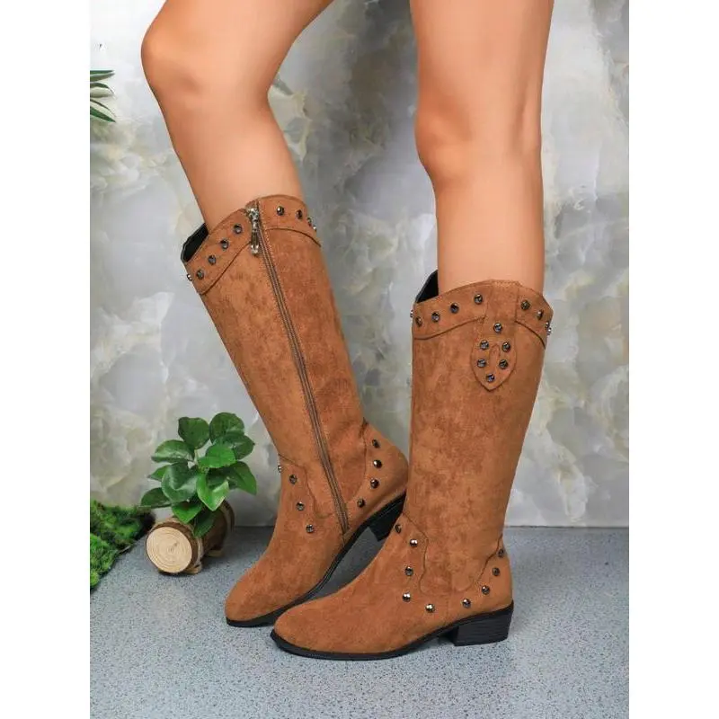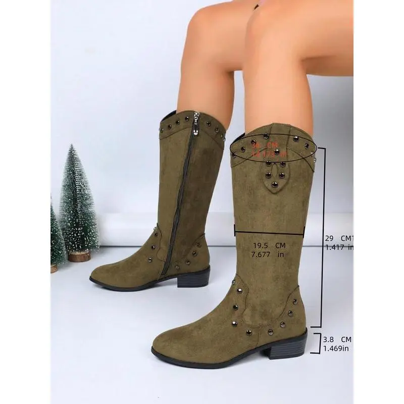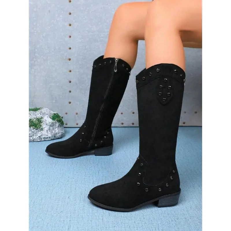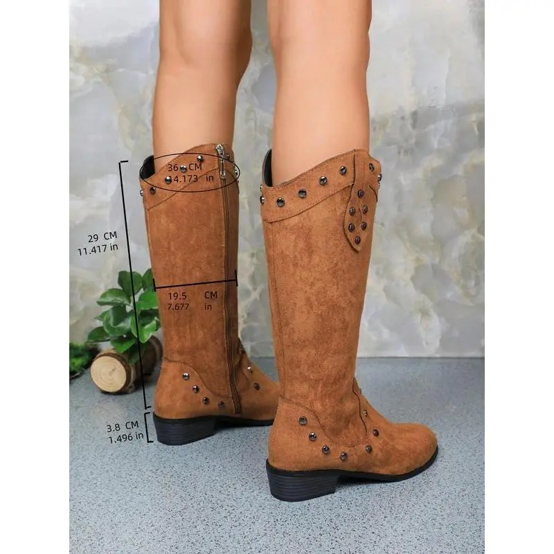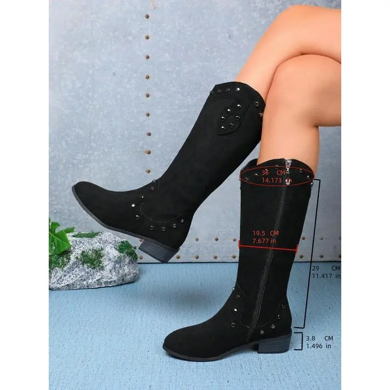 Women's Fashionable Studded Decor?Wide Calf Boots, Elegant Round Toe Boots for Daily Wear, Comfortable Boots for Women & Girls