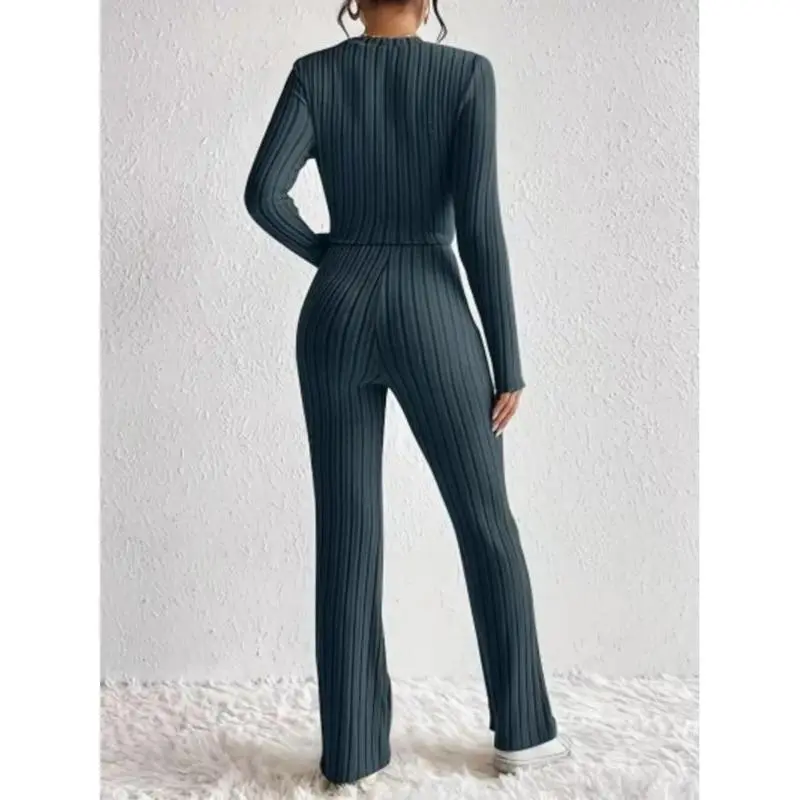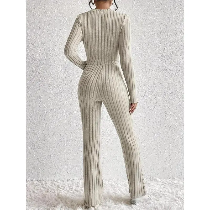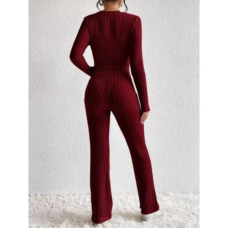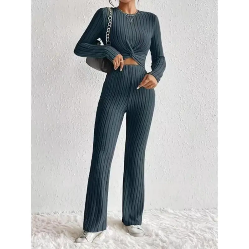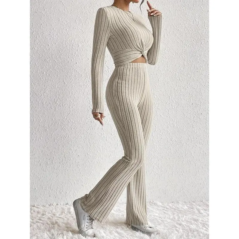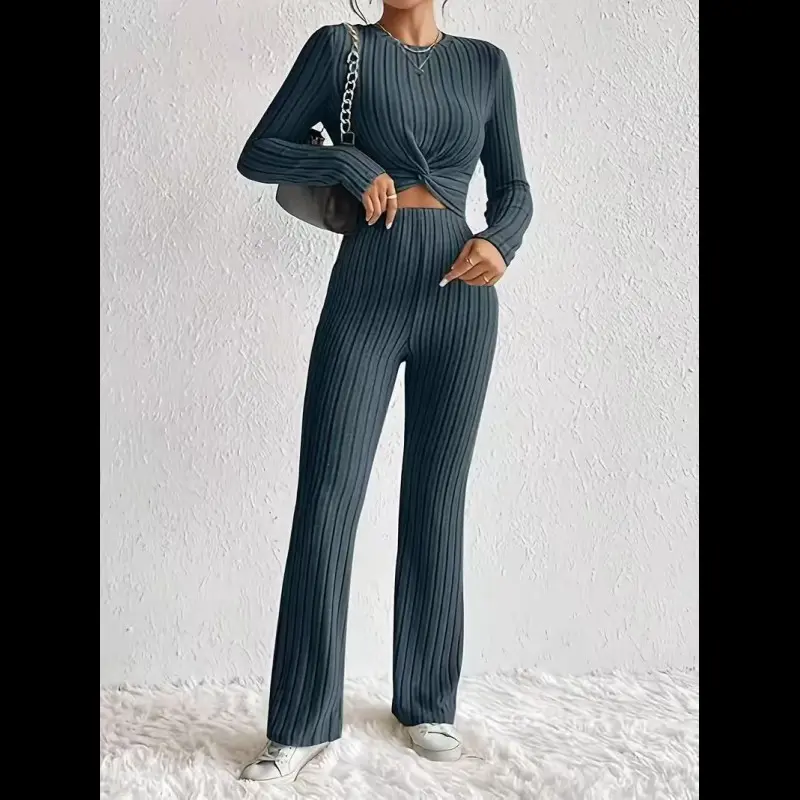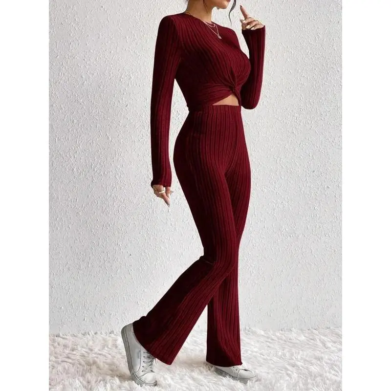 Women's Solid Ribbed Twist Tee & Flare Leg Pants Set, Elegant Fashion Casual Round Neck Long Sleeve Top & Trousers for Daily Outdoor Wear, Women's Clothing for Fall & Winter, Womenswear