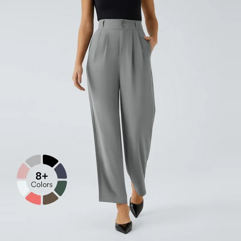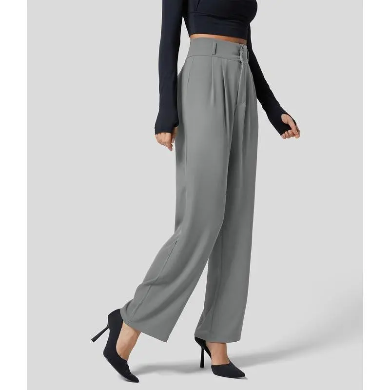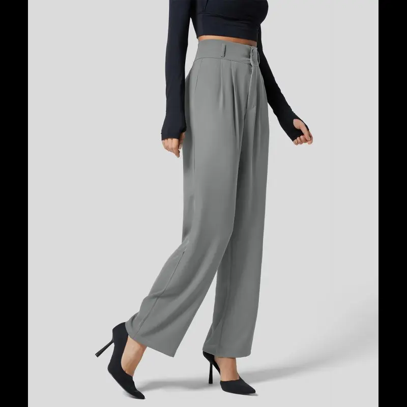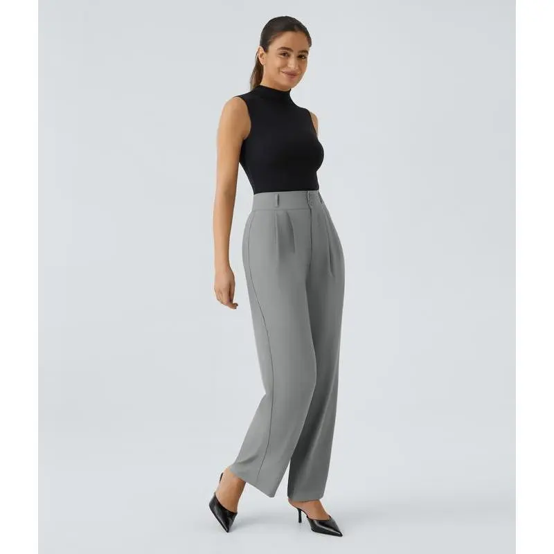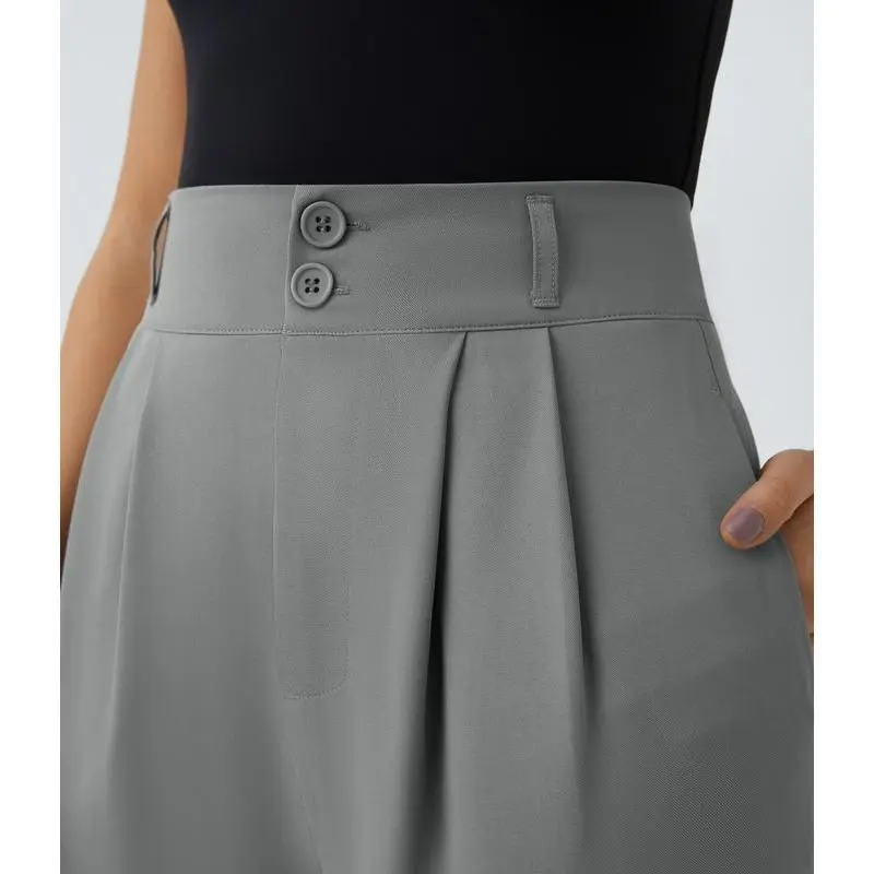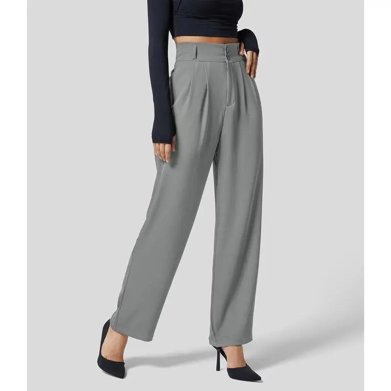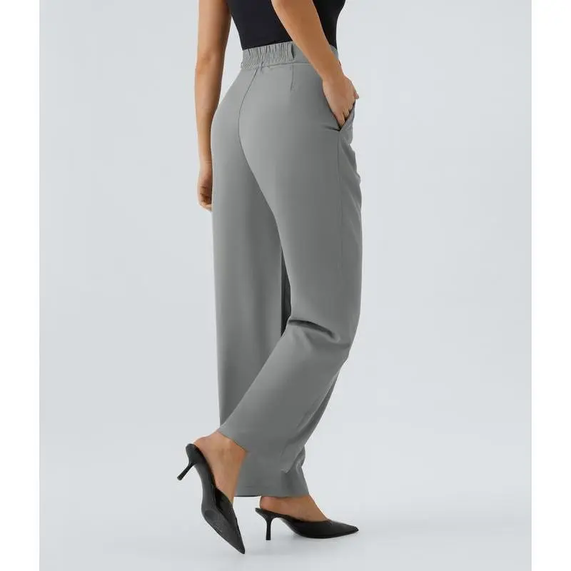 High Waisted Zipper Pocket Shirred Straight Leg Work Pants