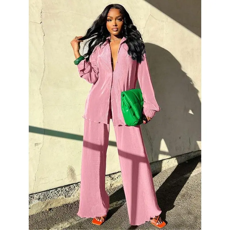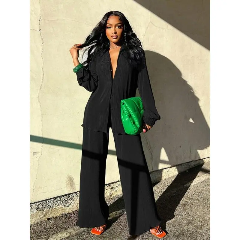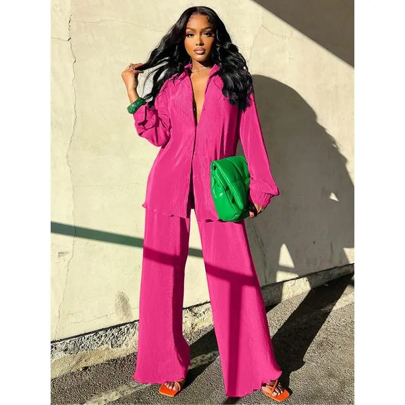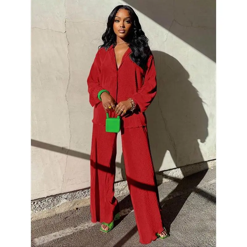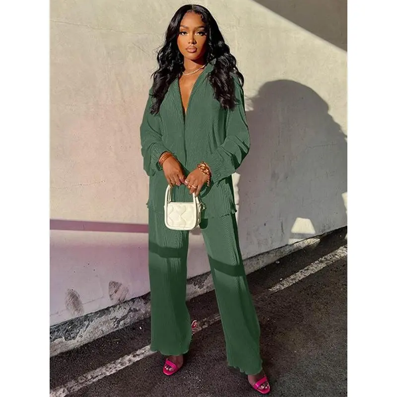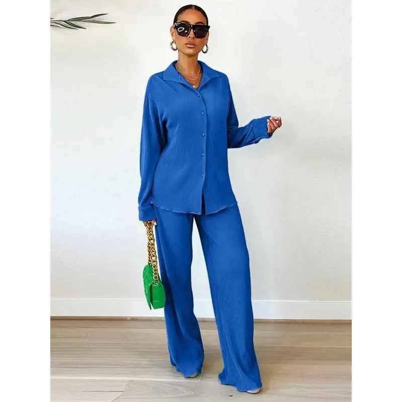Women's Solid Button Front Shirt & Elastic Waist Pants Two-piece Set, Casual Lettuce Trim Long Sleeve Collared Top & Wide Leg Trousers for Spring & Fall, Women's Clothes for Daily Wear