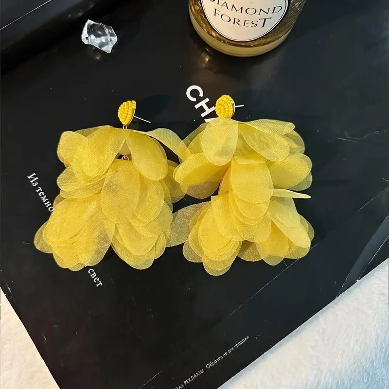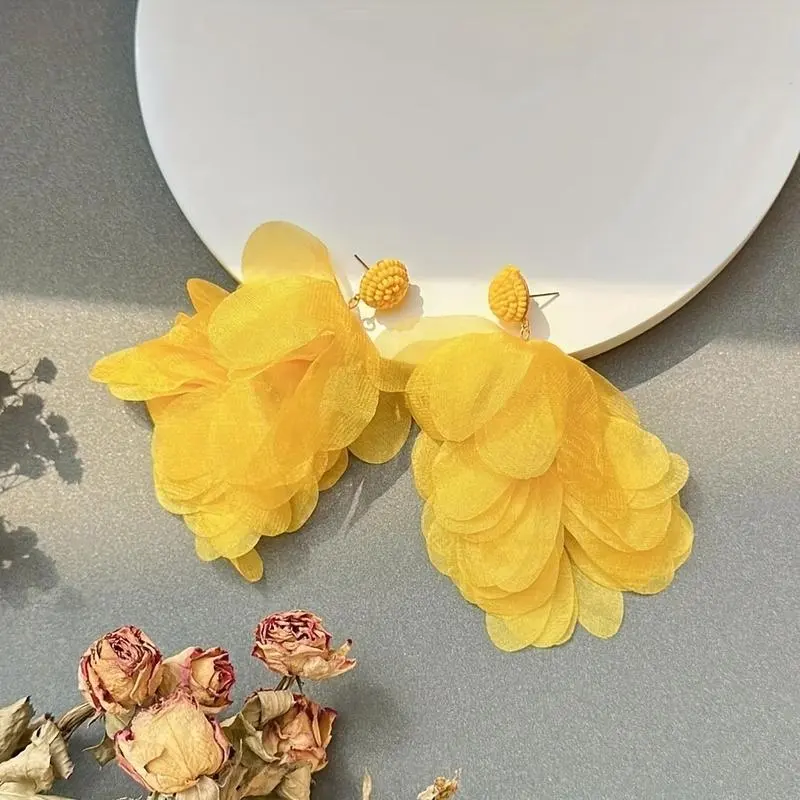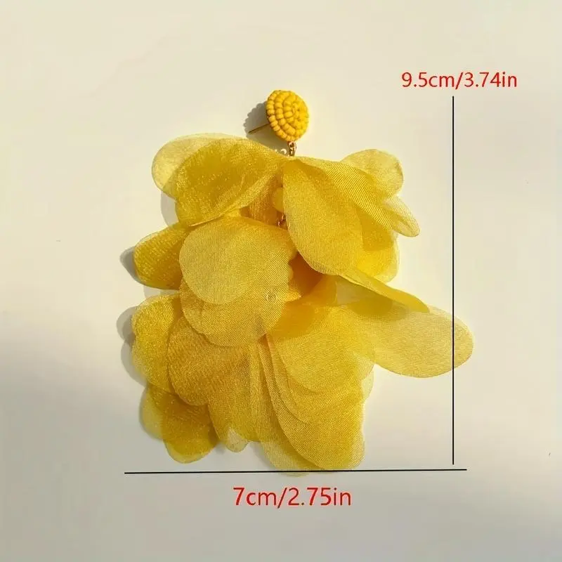 Yellow Fabric Flower Petals Dangle Earrings - Bohemian Style, Vacation Ready, Summer Beach Holiday Accessories, Handcrafted, Lightweight, Hypoallergenic, Beachy Chic Jewelry for Women