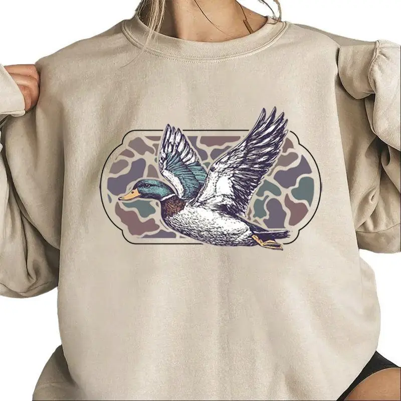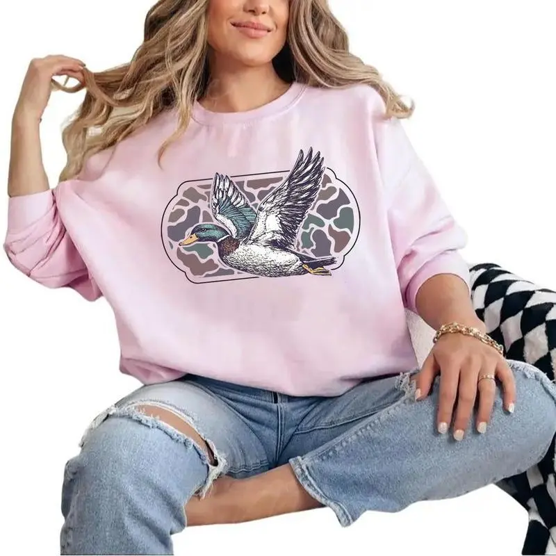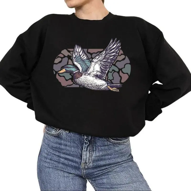 Camo Flying Mallard Bird Old School Camo Vintage Crewneck, T-shirt, Cotton Hoodie Sweatshirts Womenswear Day Love Polyester Tops