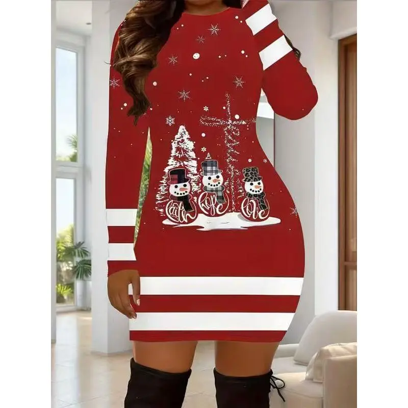 Charming Snowman Print Christmas Dress for Women - Casual Long Sleeve, Crew Neck, Bodycon Fit with Stretch Fabric Womenswear Collar Summer Crewneck