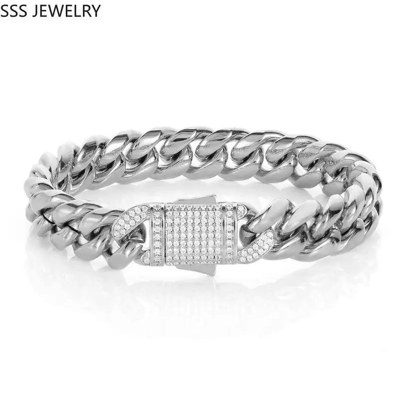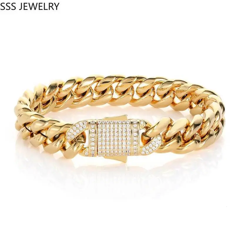 SSS Gold Miami Cuban Link Chain Icedout Buckle Clasp Cluster Diamonds Bracelet Set Titanium Jewellery 305 stainless White and Yellow Gold