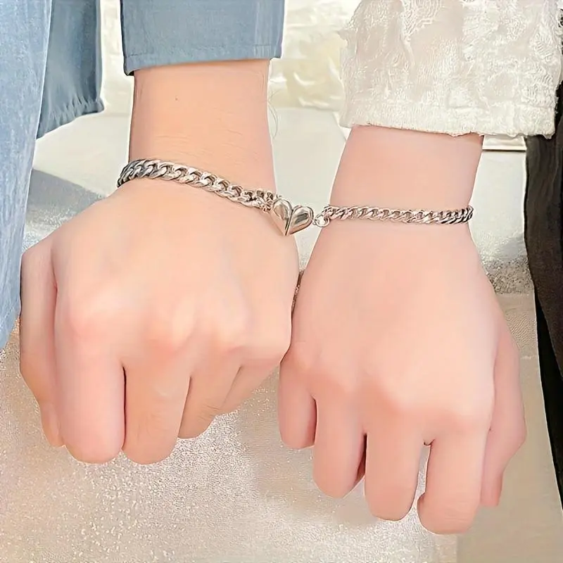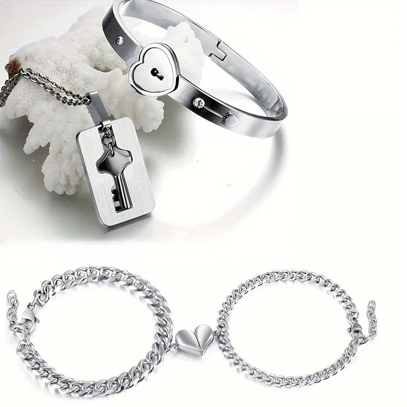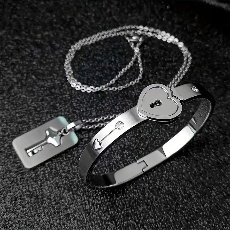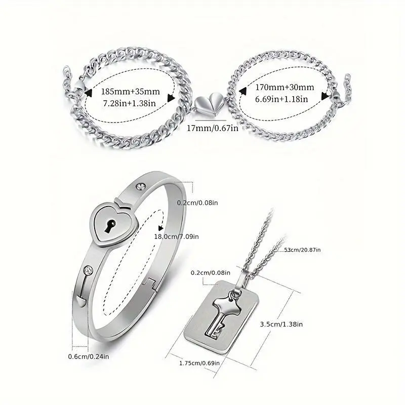 [4pcs Stainless Steel Couple Jewelry] 4pcs Stainless Steel Couple Rhinestone Bracelet Set with Heart Lock And Key Necklace - Couple Jewelry Set
