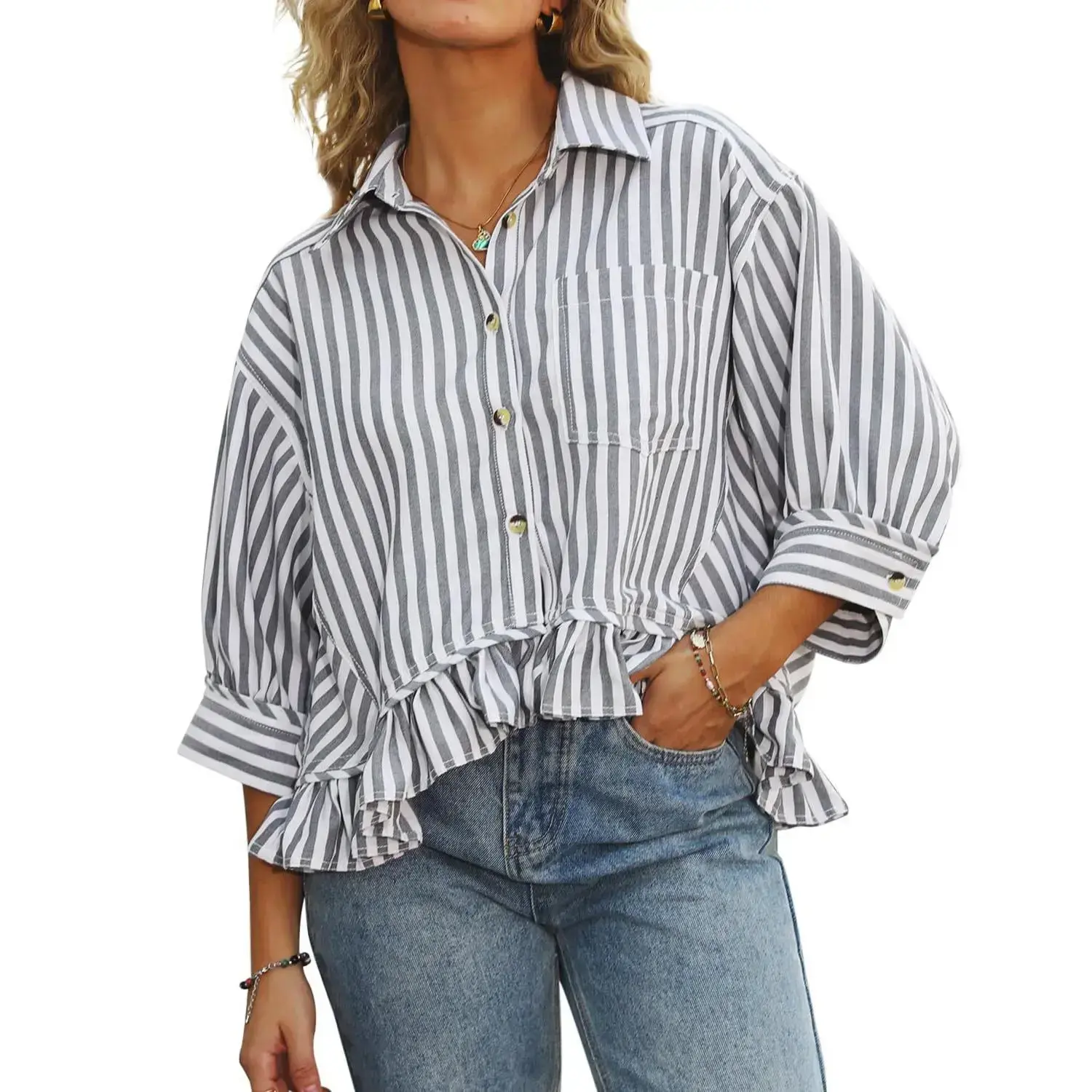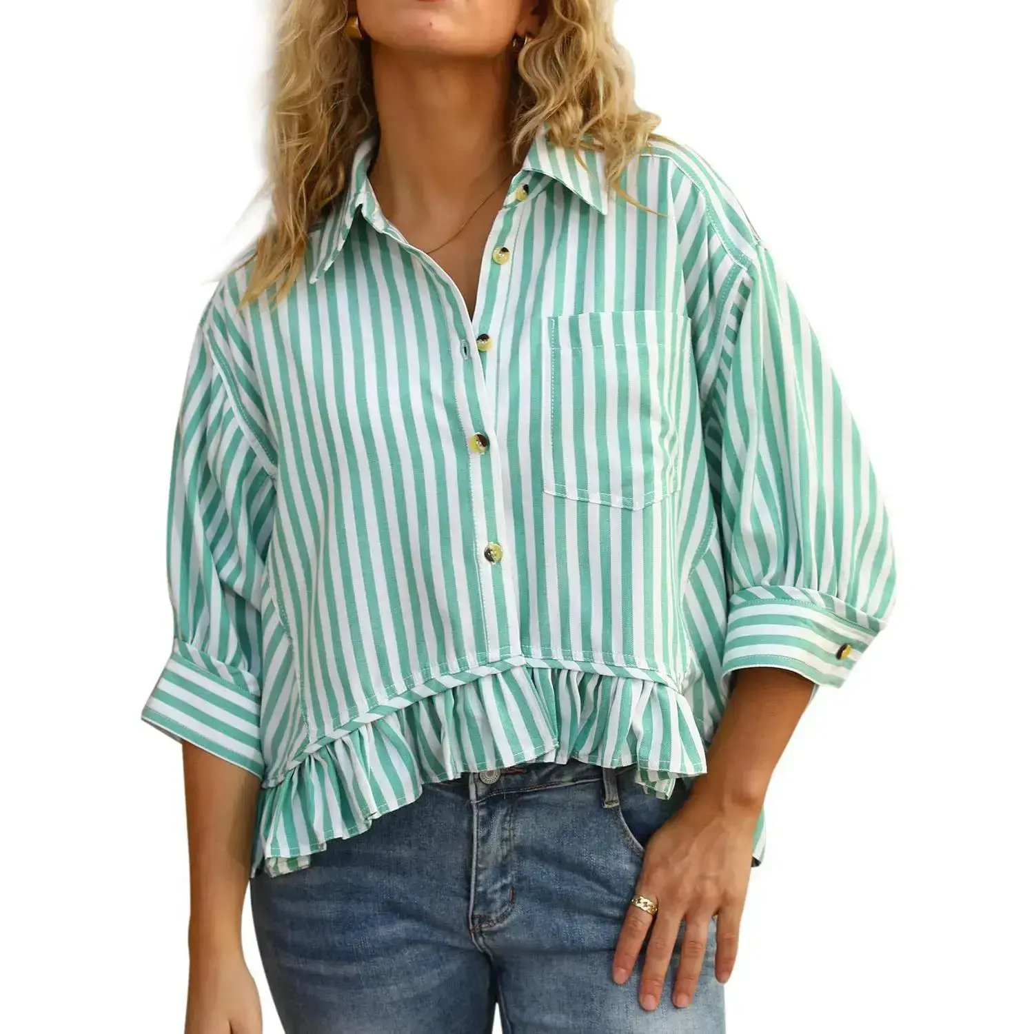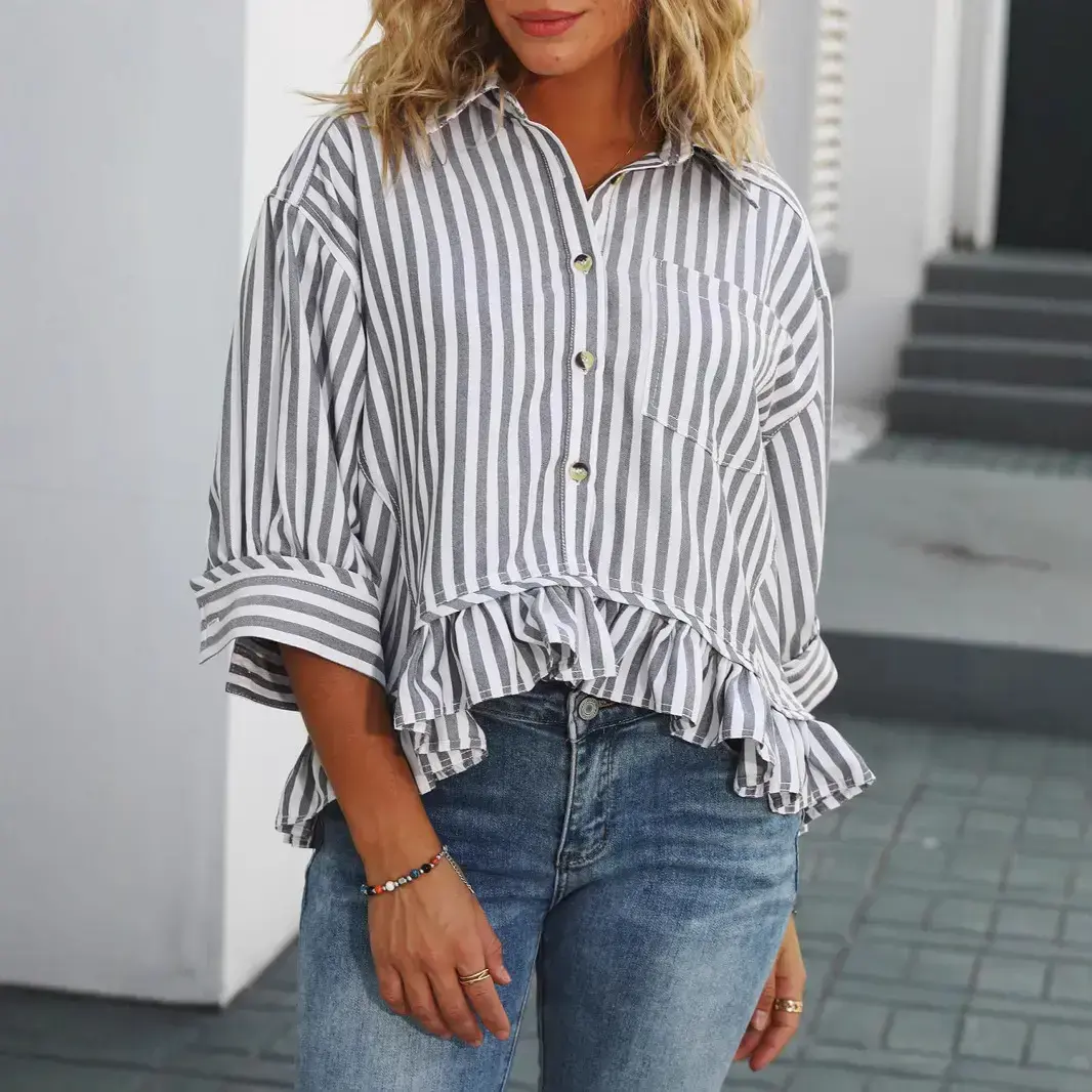2025 Spring Summer New Women's Commuting Fashion Striped Shirt with Lace Hem Design, Five-Sleeve Loose Shirt, Workplace Casual Versatile Top
