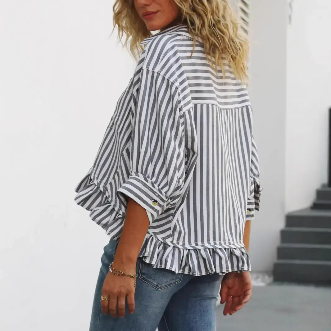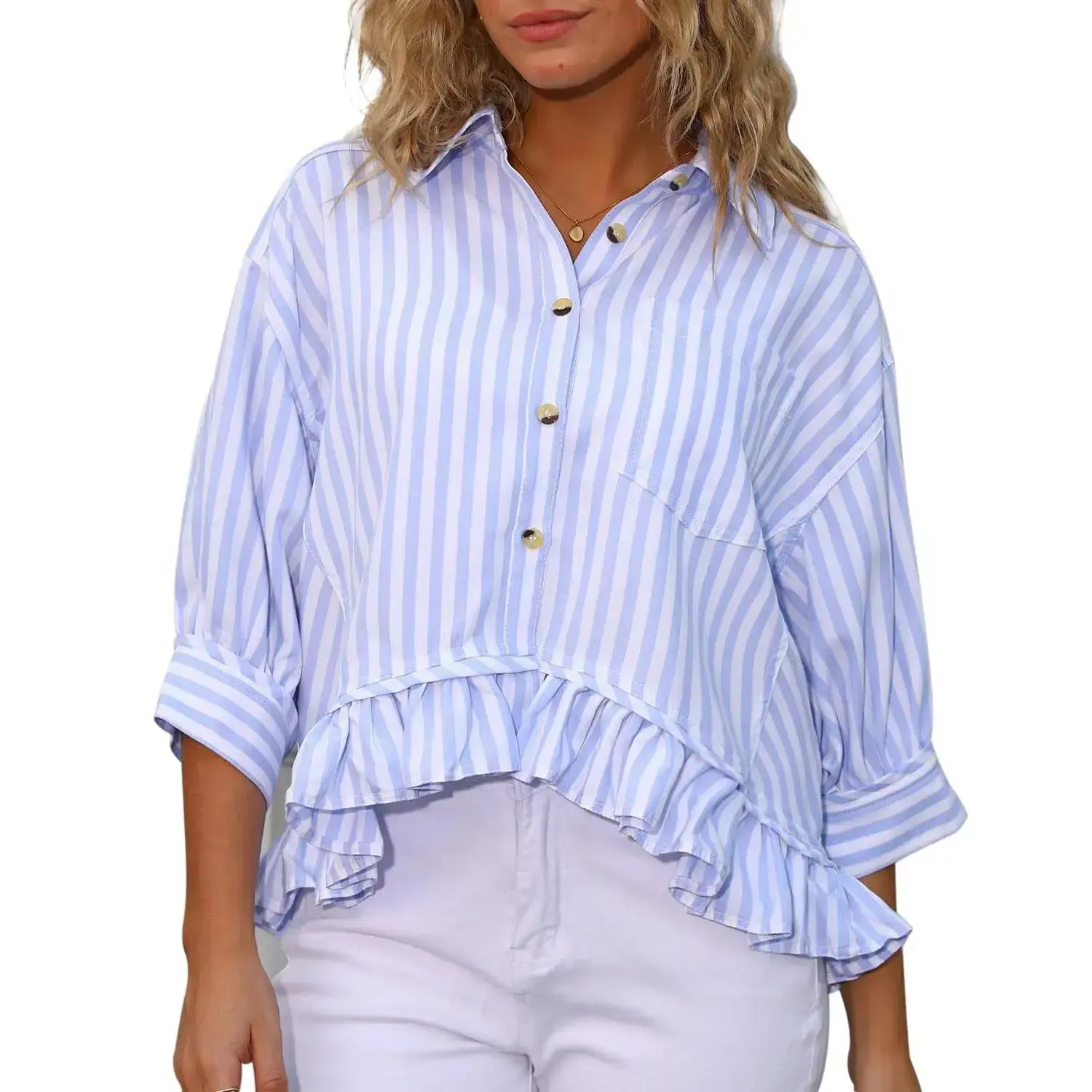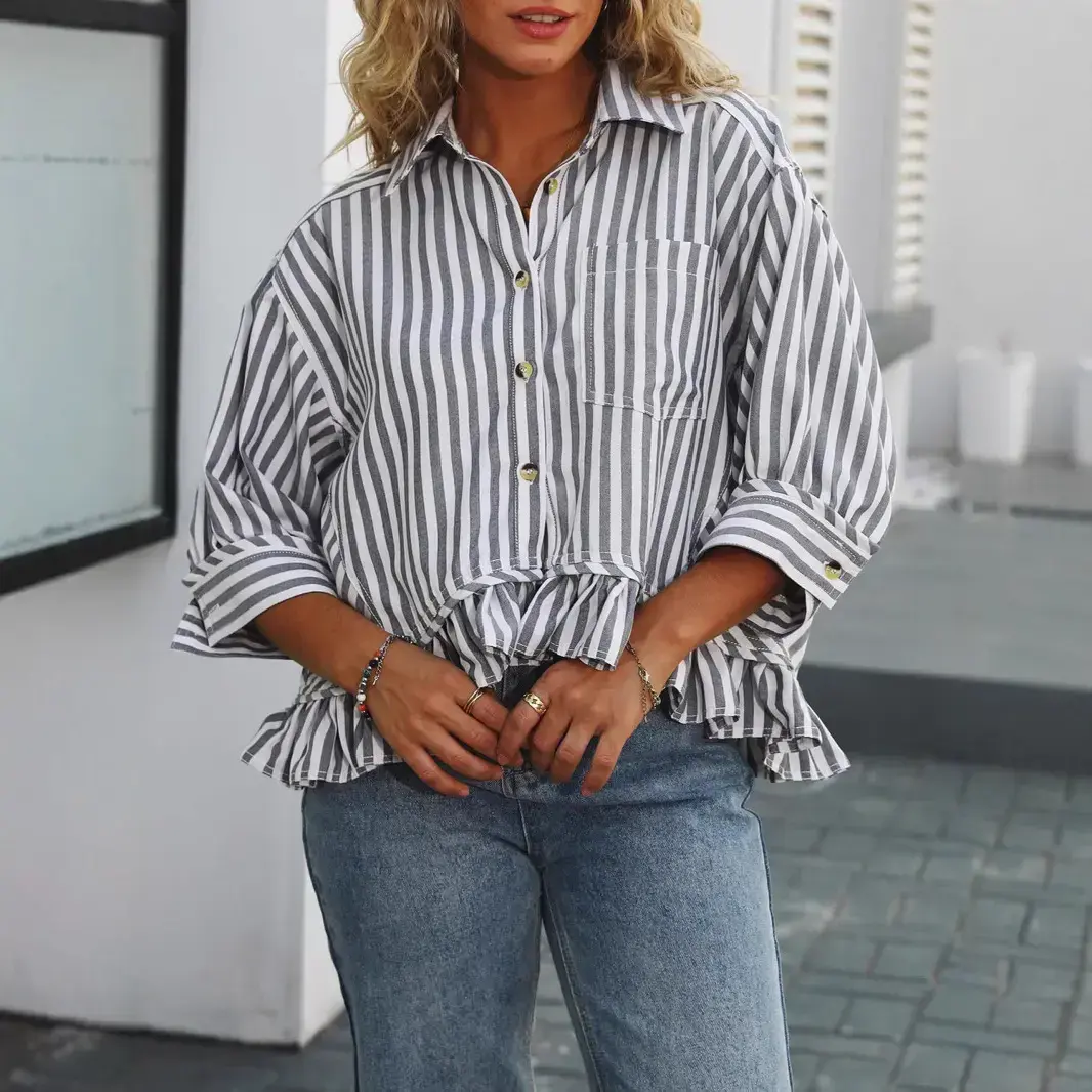 2025 Spring Summer New Women's Commuting Fashion Striped Shirt with Lace Hem Design, Five-Sleeve Loose Shirt, Workplace Casual Versatile Top