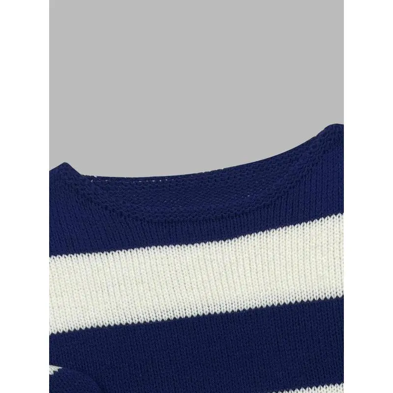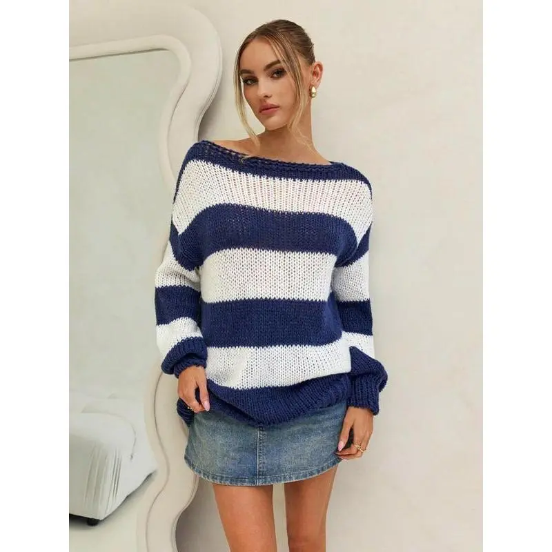 Plus Size Off-Shoulder Striped Sweater, Loose-Fitting Long Sleeve Knitwear for Spring & Fall, Comfortable Moderate Fabric