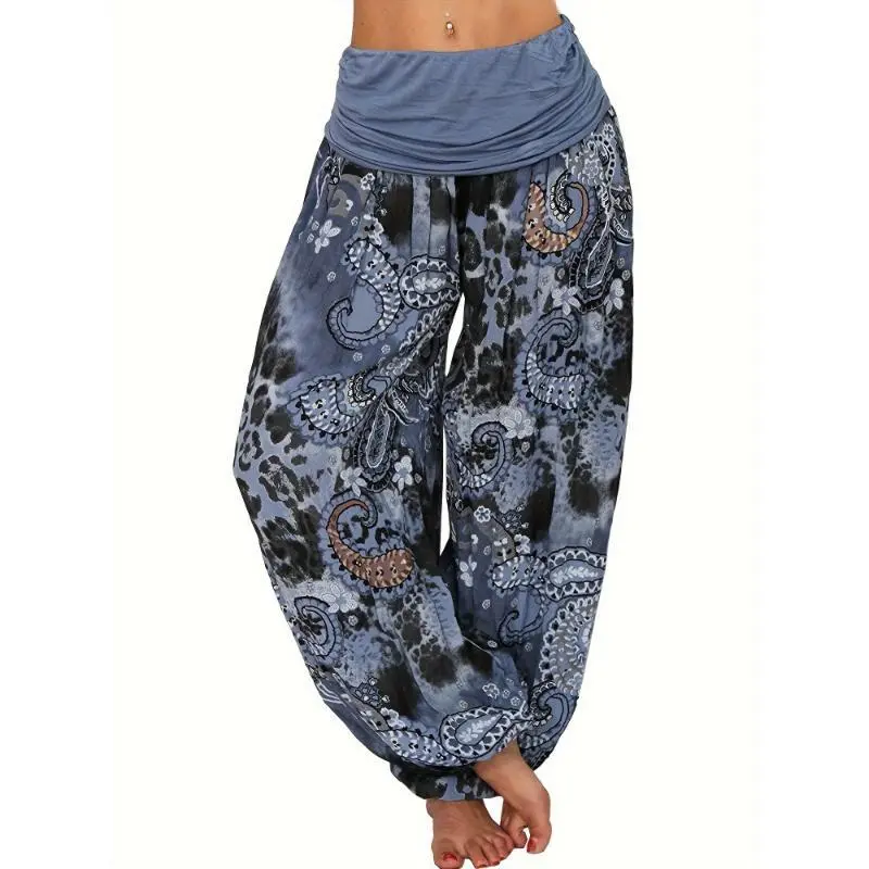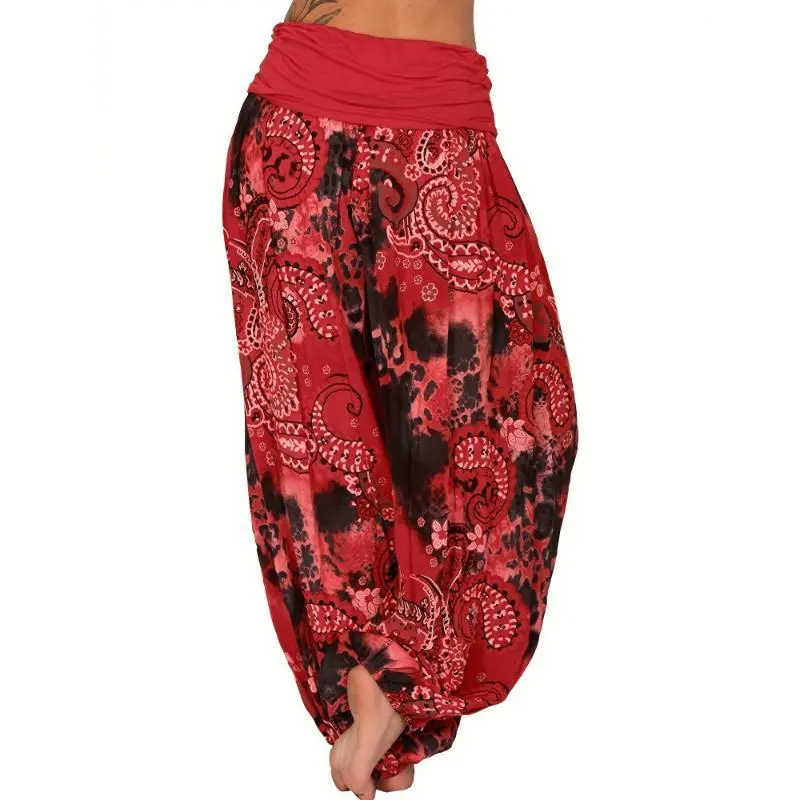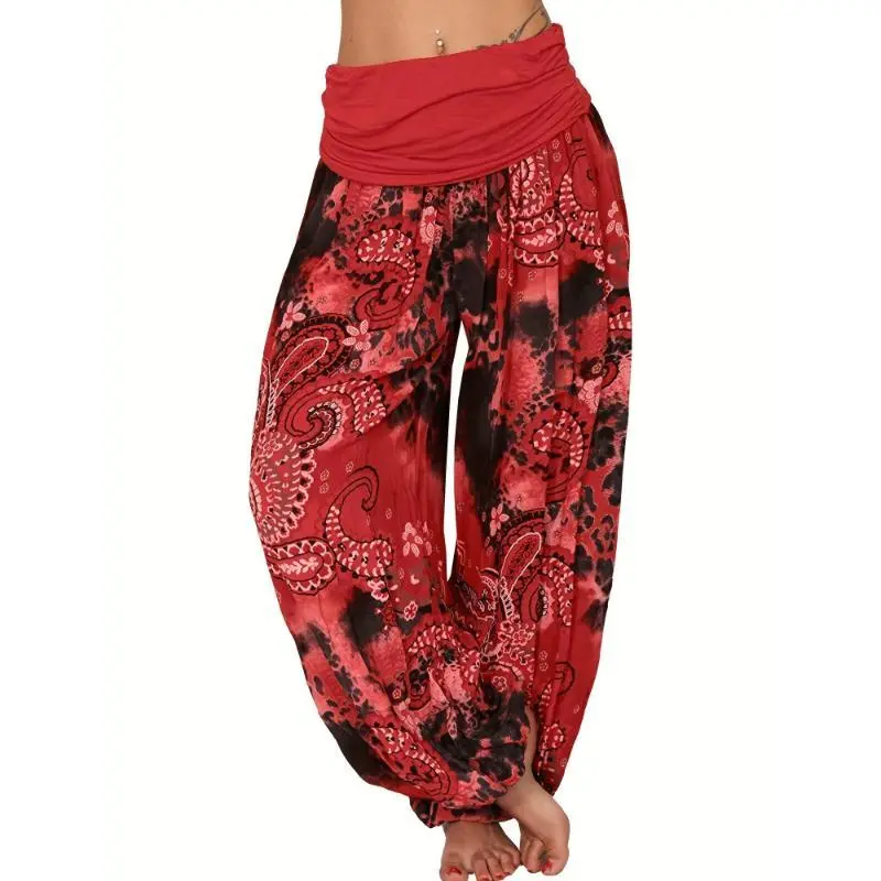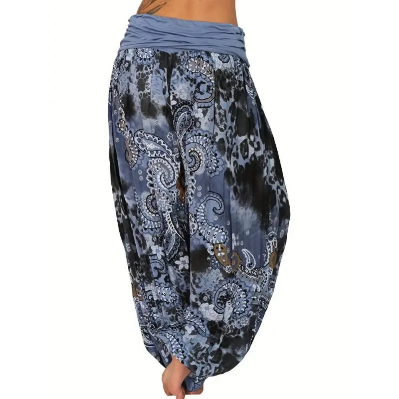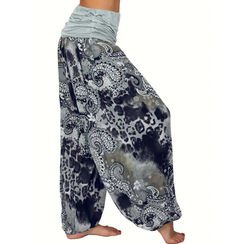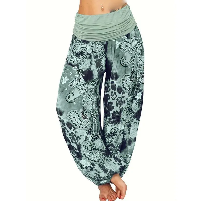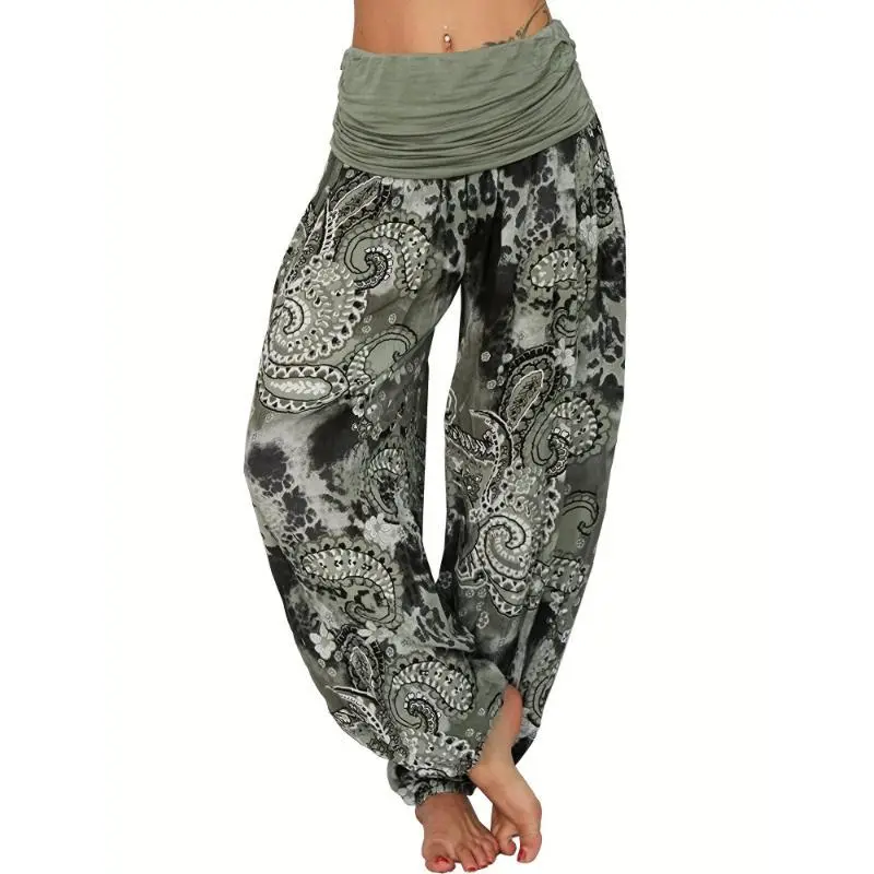 Plus Size Boho Harem Pants - Vintage Floral Print with Ruched Waist. Lightweight Khaki Fabric, Comfortable Baggy Fit for Vacation & All Seasons. | Bottoms Womenswear