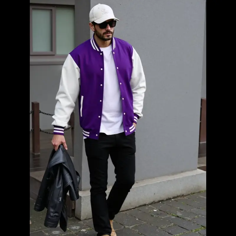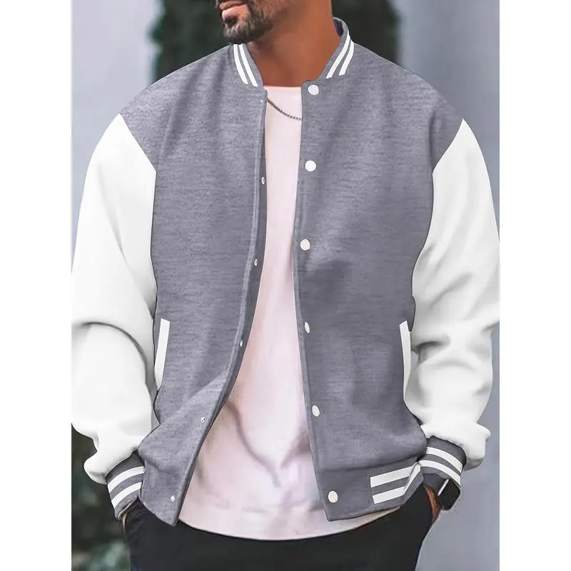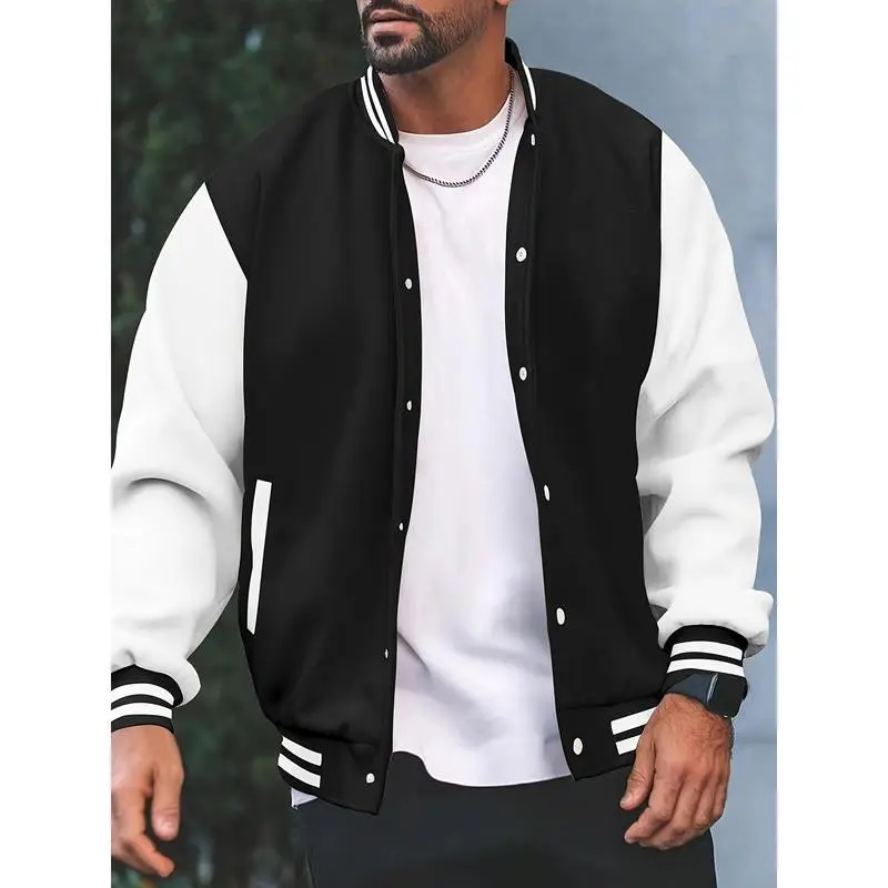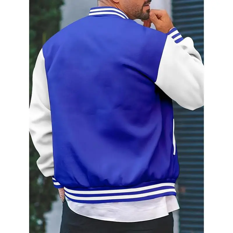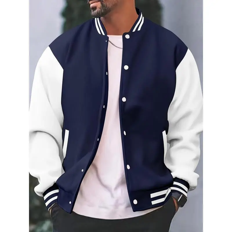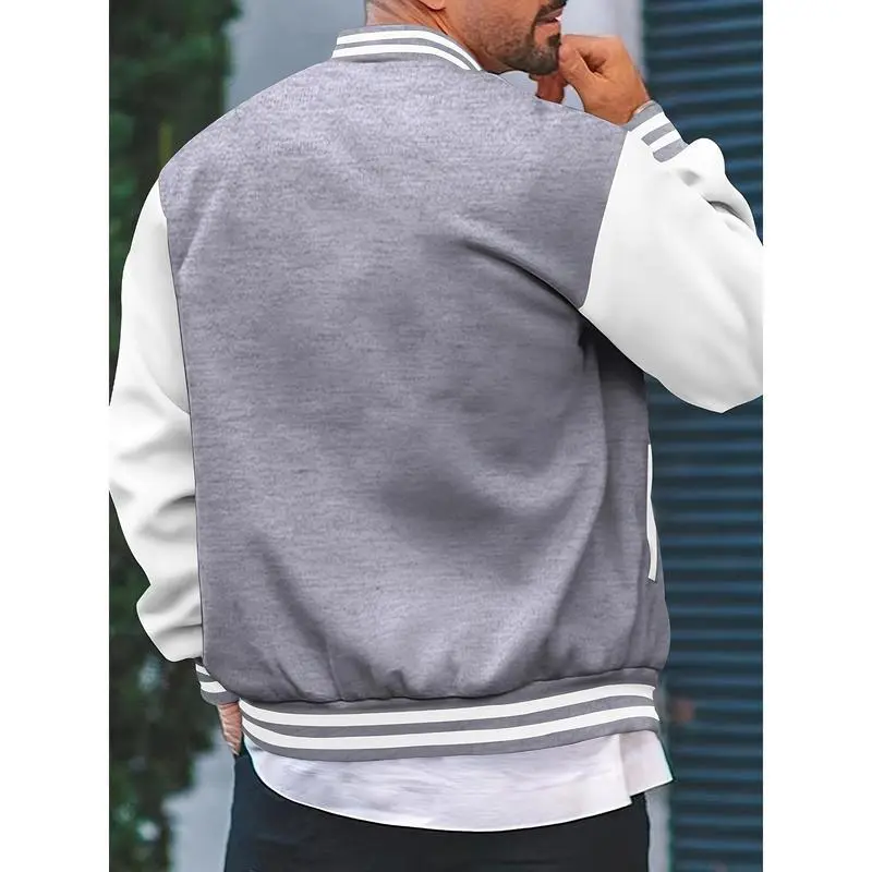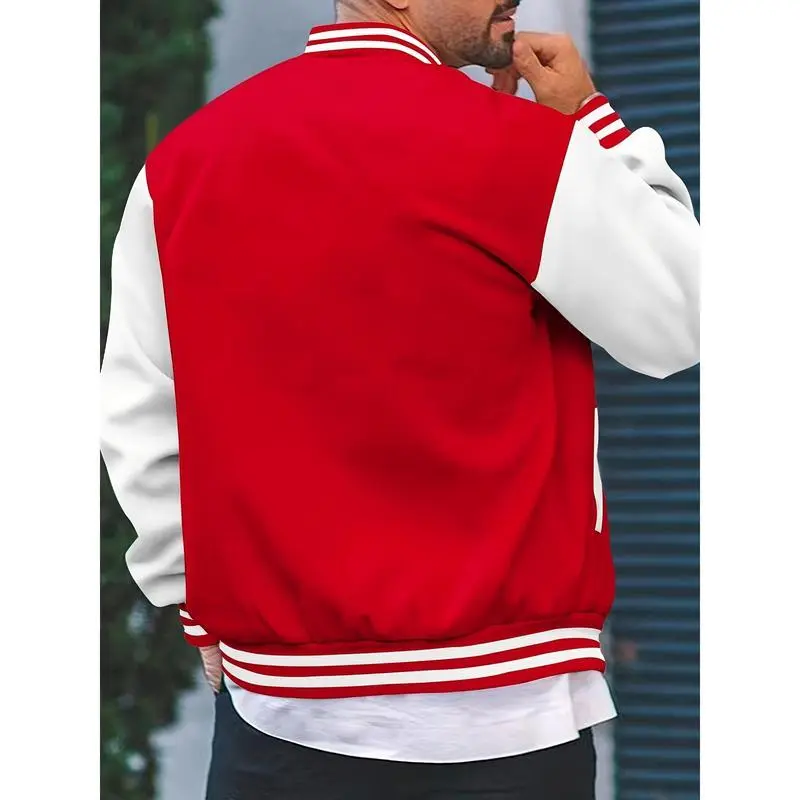 Men's Casual Varsity Jacket - Red & White Striped Baseball Collar, Long Sleeve with Pockets, Polyester Blend, Machine Washable, Perfect for Spring and Fall, Fall Jacket | Striped Ribbed Details | Leatherlike Finish