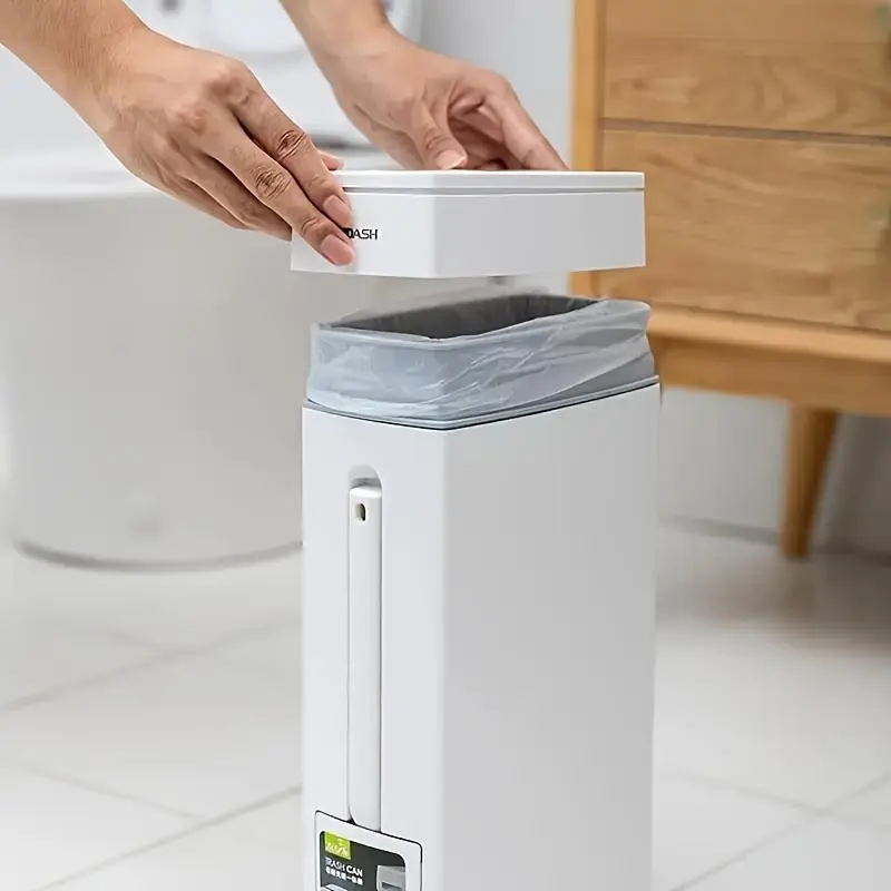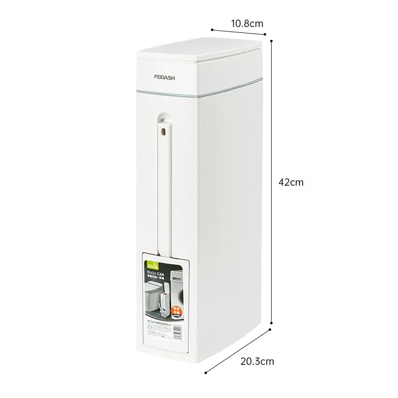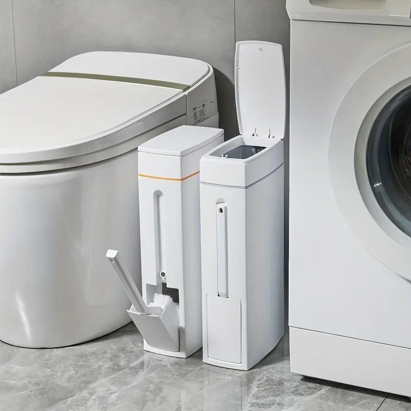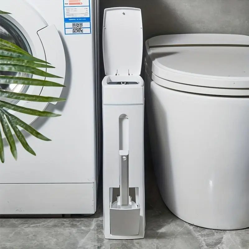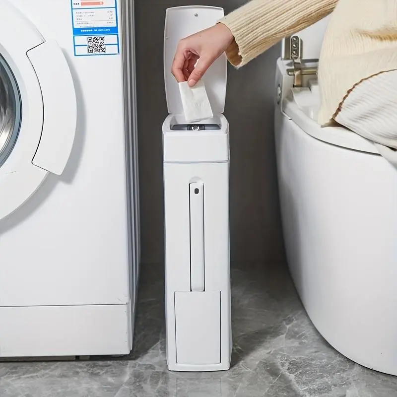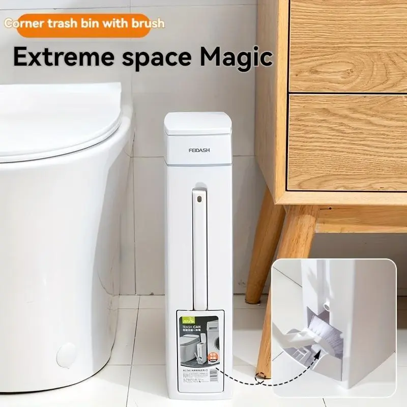 Space-saving ultra-thin corner trash can with toilet brush and holder – compact rectangular bathroom trash can with durable plastic design, no power required, compatible with toilet paper holders, ultimate storage wonder, multi-f