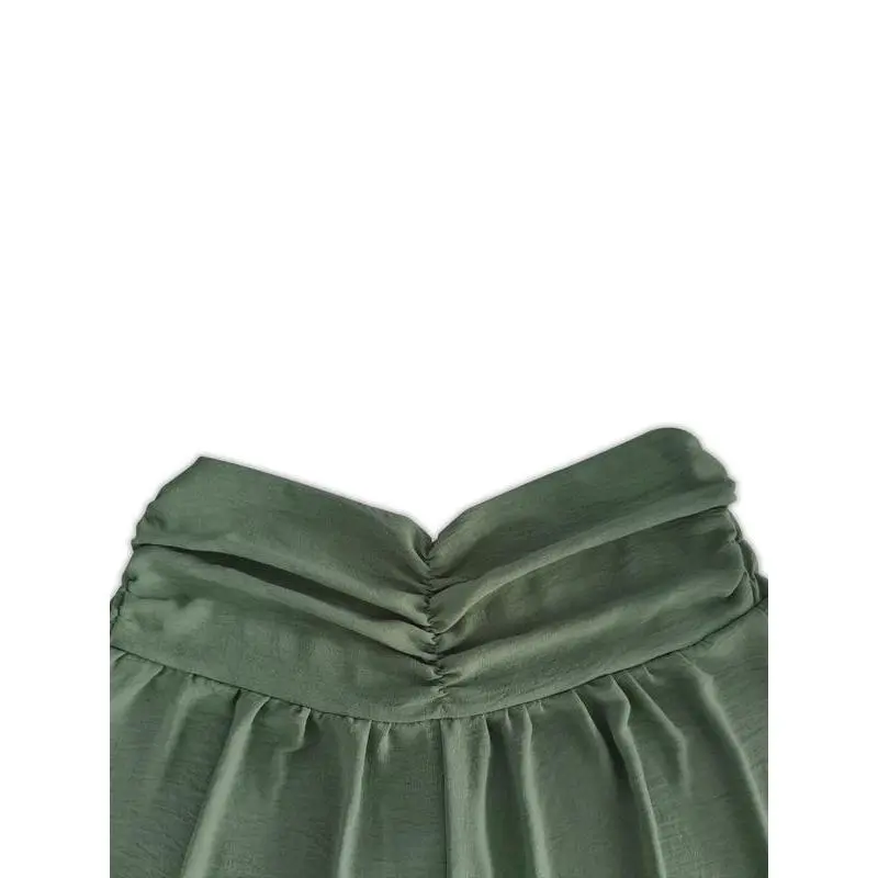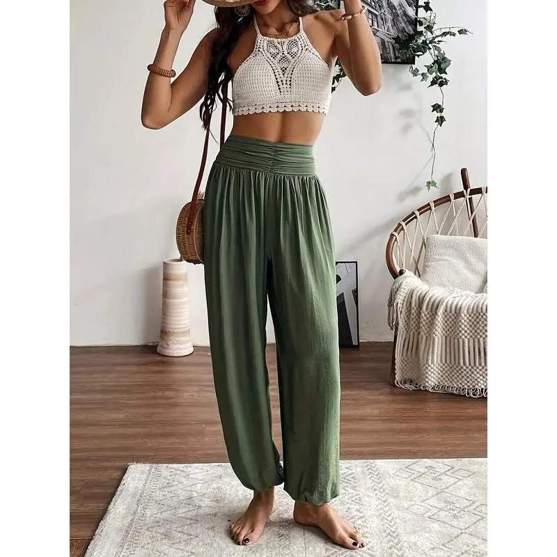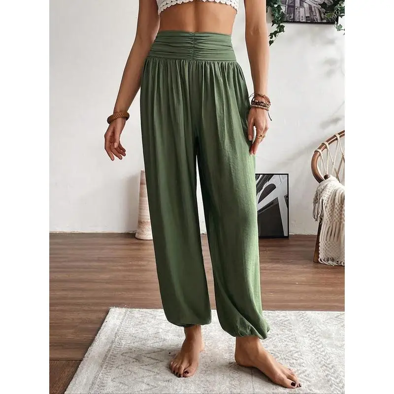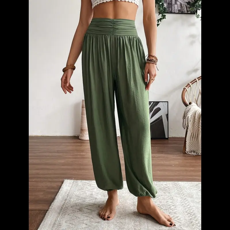 A fashionable and casual high waisted elastic waisted pleated loose solid color pants for women, suitable for beach vacations and daily sports and fitness wear