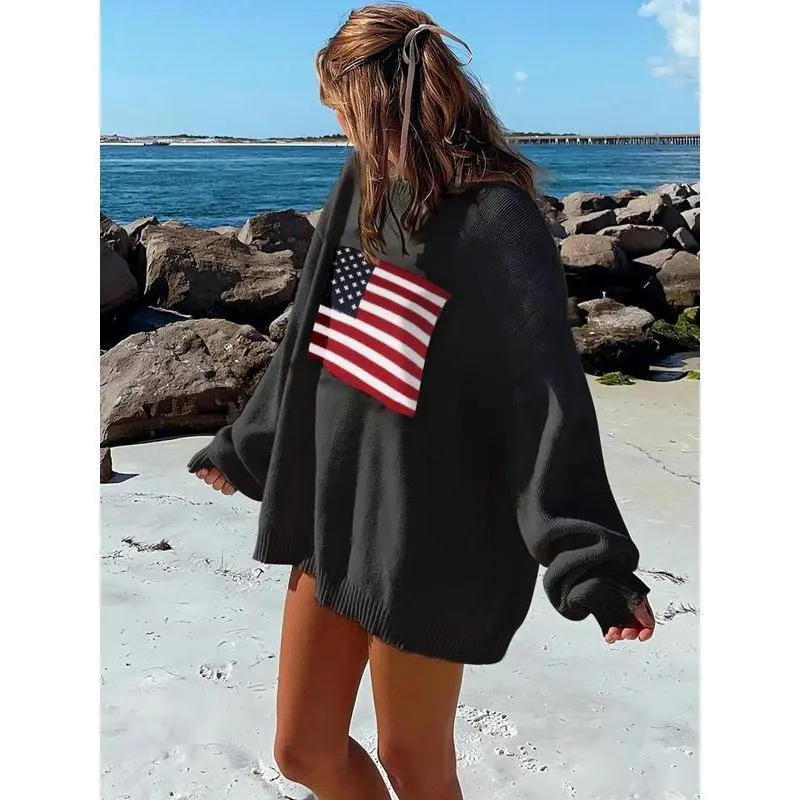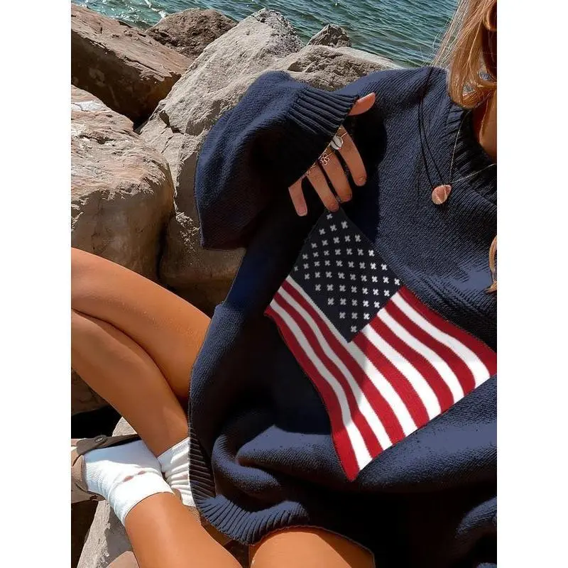 Women's American Flag Print Drop Shoulder Spring 4th Of July Sweater, Casual Fashion Loose Fit Longsleeves Round Neck Jumper for Fall, Womenswear Knitting Tops, Women's Gamis Crewneck Hoodie Sweatshirts Pullover Baggy Oversize Oversized Knitwear White