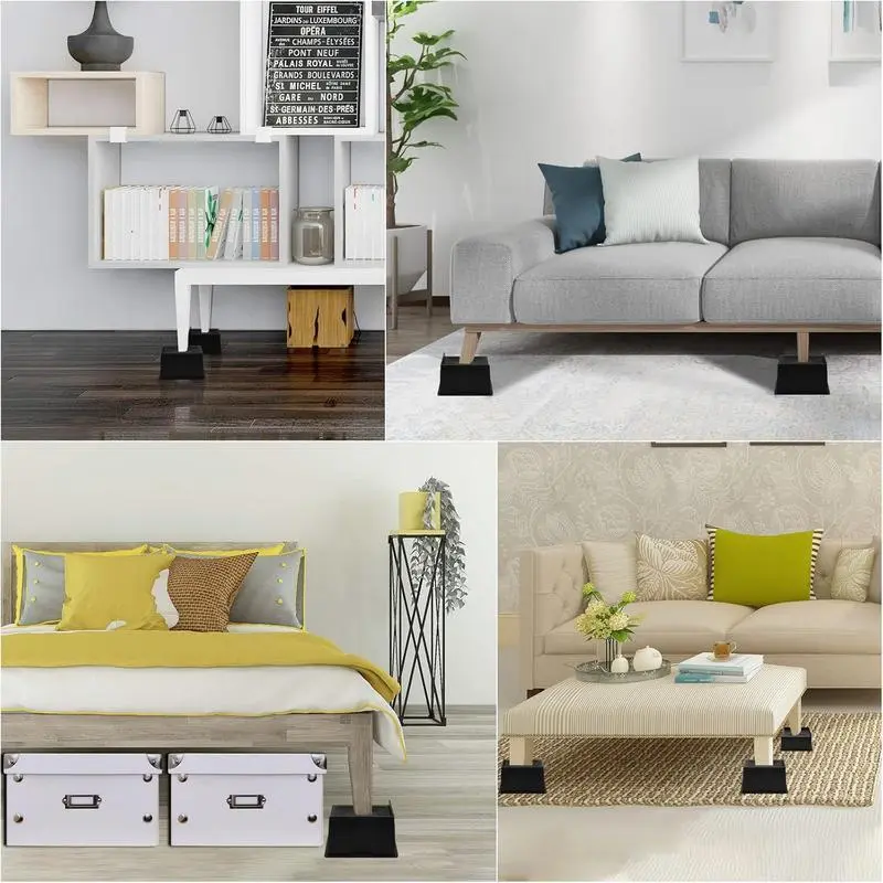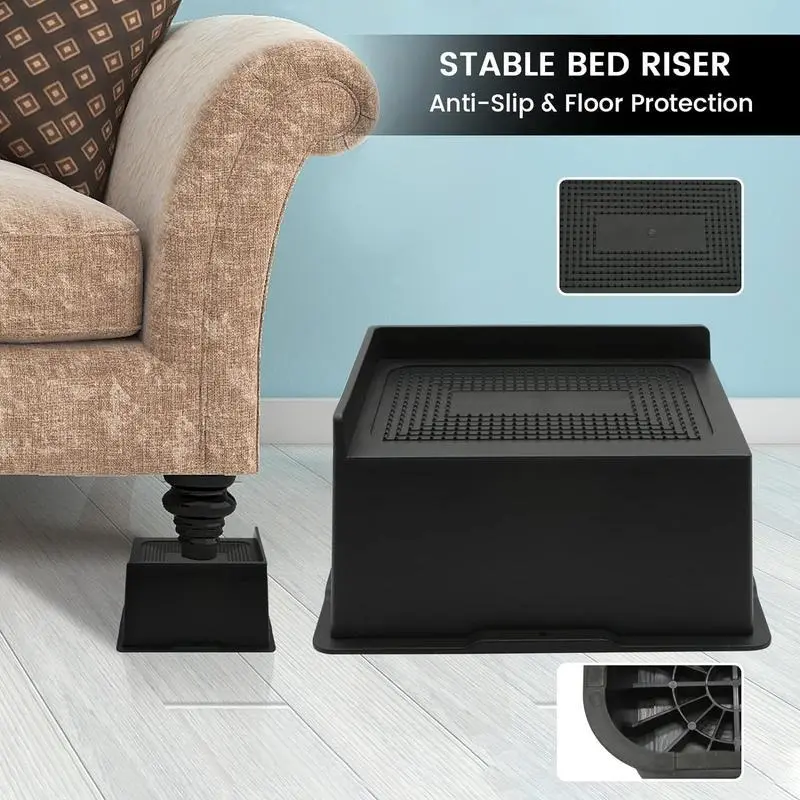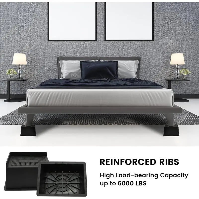 Half Side Designthe L shaped bed risers raised edge allowing you to slide bed risers under the legs easily2 side raised edge also makes the risers to easier to match different furniture legs.Oversized Bed RisersThe widened and enlarged top surface provides a 4.7x8.26 inch contact area,which provides a strong stability, even heavy duty furnitureAdditional conveniencesThis bed risers not only can elevation furniture to 6 inch to create extra space for storage, but also can lifts furniture up to makes your home easy to cleanHeavy duty bed risersdurable ABS material with reinforced ribs, these bed risers can support up to 6000 lb.therefor a twin, king, queen bed will be feel steadyAnti-Slip & Floor Protectionthe taper at the top to prevent furniture from slidingthe rubber bottom layer can effectively absorb shock and protect the ground from scratches Half Side Design; the L shaped bed risers raised edge allowing you to slide bed risers under the legs easily; 2 side raised edge also makes the risers to easier to match different furniture legs. Oversized Bed Risers; The widened and enlarged top surface provides a 4.7x8.26 inch contact area,which provides a strong stability, even heavy duty furniture Extra conveniences; This bed risers not only can elevation furniture to 6 inch to create extra space for storage, but also can lifts furniture up to makes your home easy to clean Heavy duty bed risers; durable ABS material with reinforced ribs, these bed risers can support up to 6000 lb.therefor a twin, king, queen bed will be feel steady Anti-Slip & Floor Protection; the taper at the top to prevent furniture from sliding; the rubber bottom layer can effectively absorb shock and protect the ground from scratches