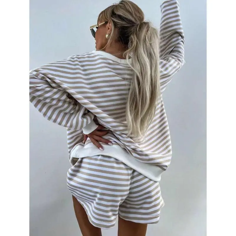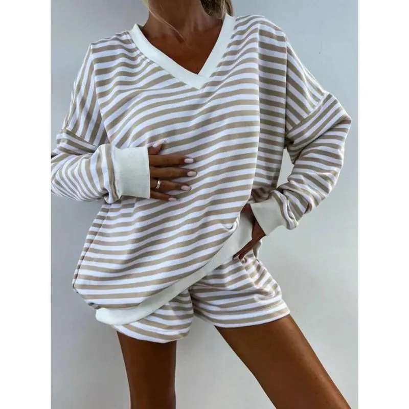 Women Striped Long Sleeve Top & Shorts, Loose Printed Color Block Pajama Set, Casual Loungewear Outfit Fabric Nightwear