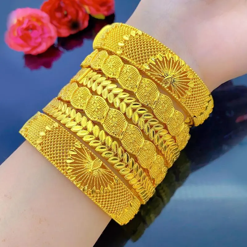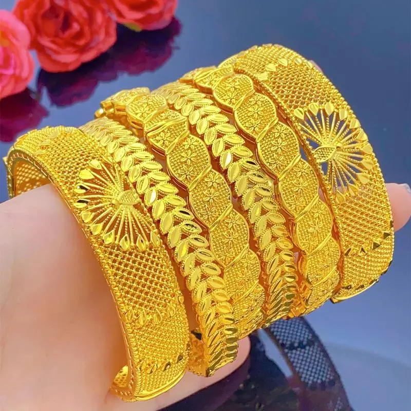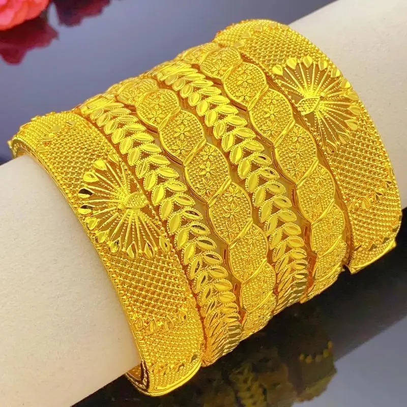2pcs 24K plated bracelet bangles Brides Shiny Gold Color NO-Fading Wedding Bridal matching charm Glamorous Shimmer Glitter for women Design Elegant